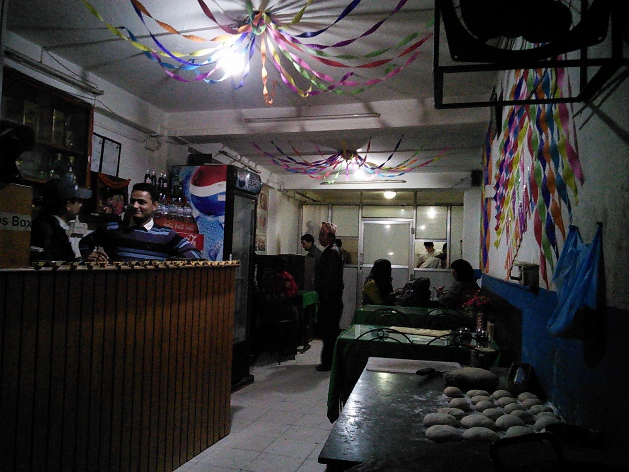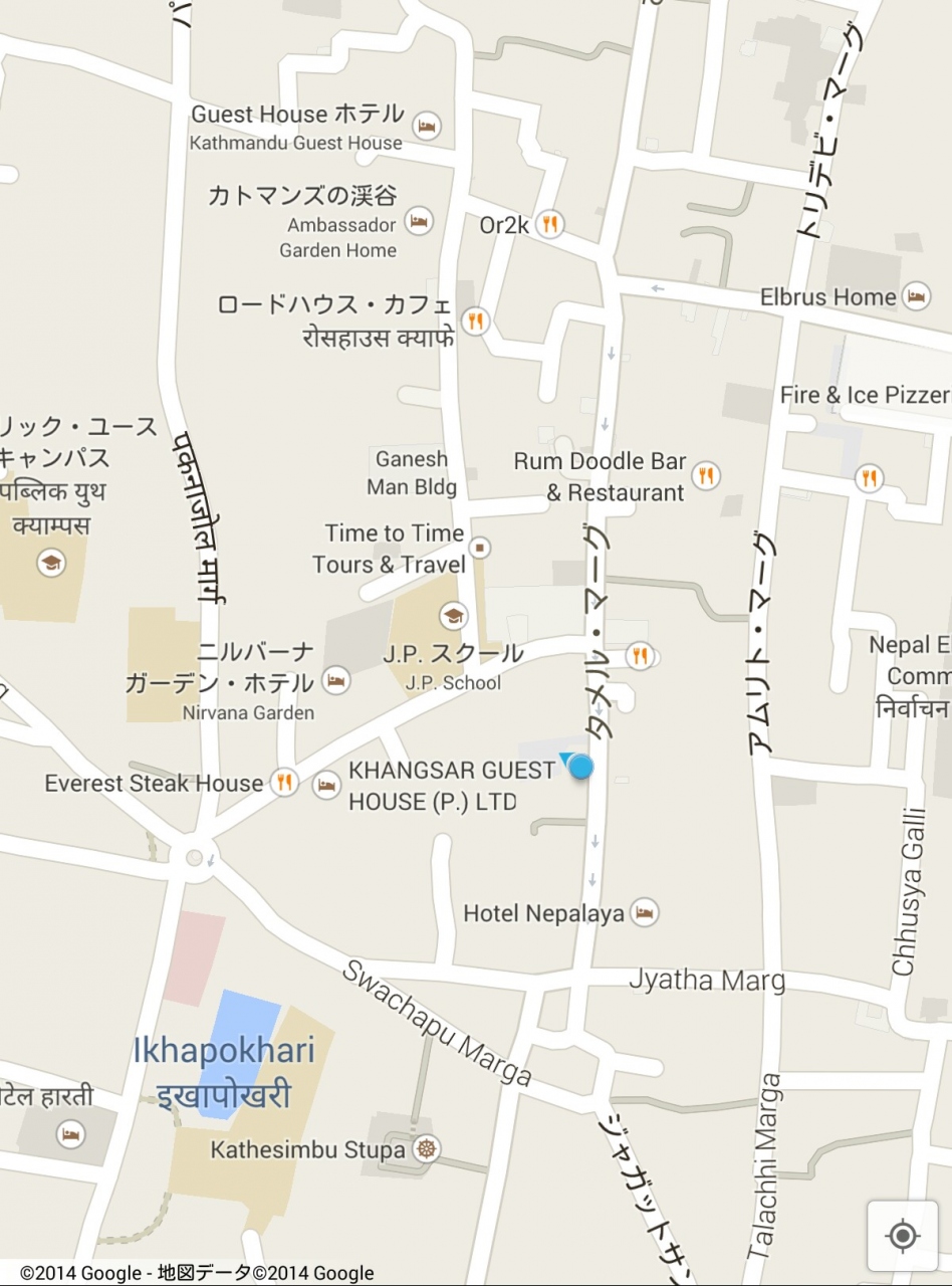 「Hotel Lumbini」の1Fにあるインド系レストランです。ダルバートである「Deluxe Meal Veg. Thali」(150Rs)をオーダー。メニューに書かれているRotiとCurdがついてきませんでしたが要求したら付けてくれました。またおかわりができると聞いていたのですが、できないと言われお願いしたらOKになりました。なんかあまりちゃんとしていませんが店の人は悪い人達ではありません。カタコトの日本語を話しむしろ友好的でいい人達でした。結果的に豪華なダルバートになり(メニュー通りですが…)、これで150Rsなら断然お得だと思います。場所はタメルチョークからタヒティーチョークへ向かう道の途中、左側に白い小さなストゥーパがあるところです。詳しくは写真の地図を参照して下さい。地図に青丸がありますが店の場所は道路をはさんだ向かい側です。