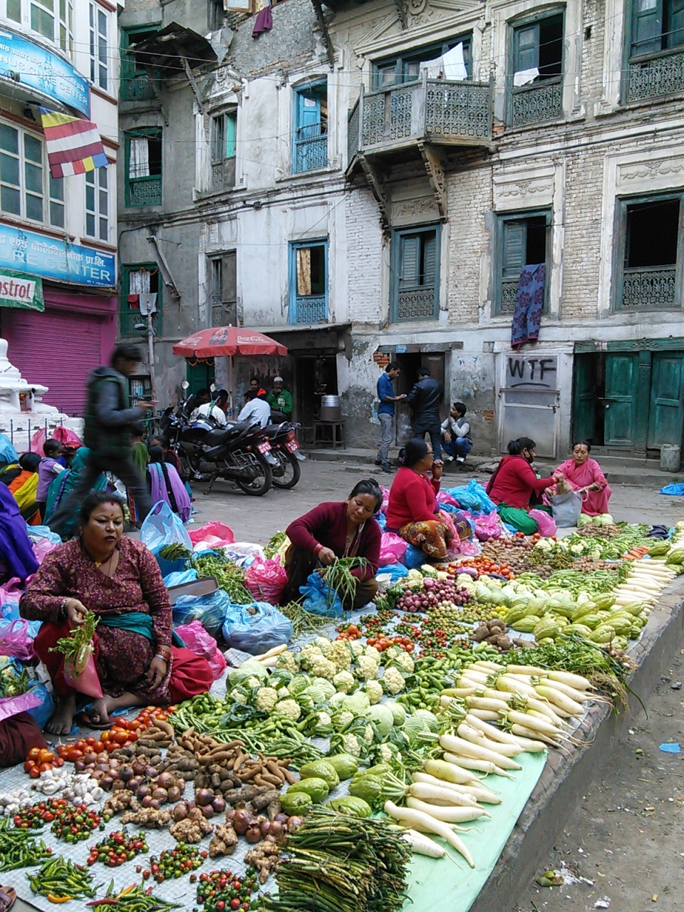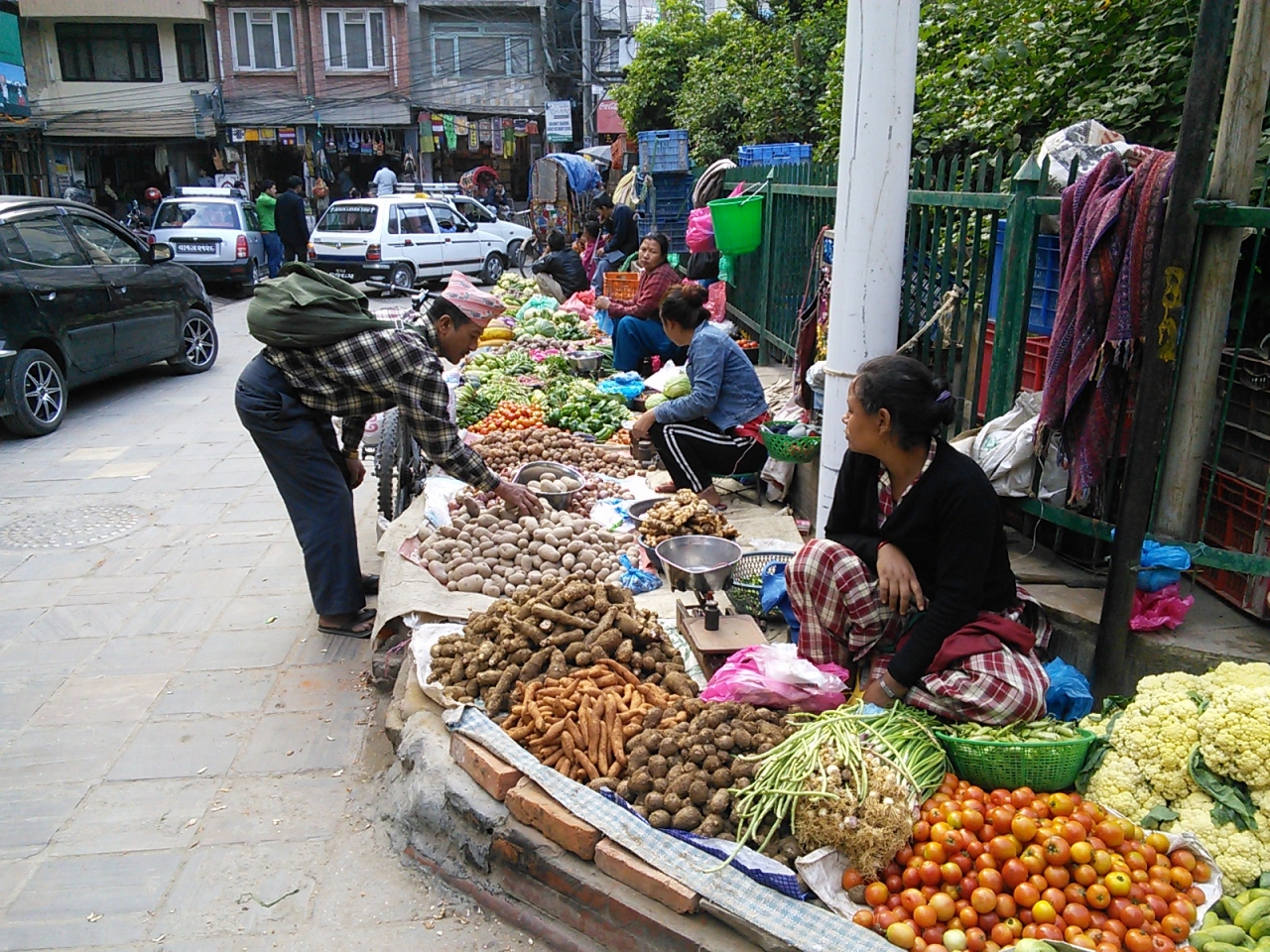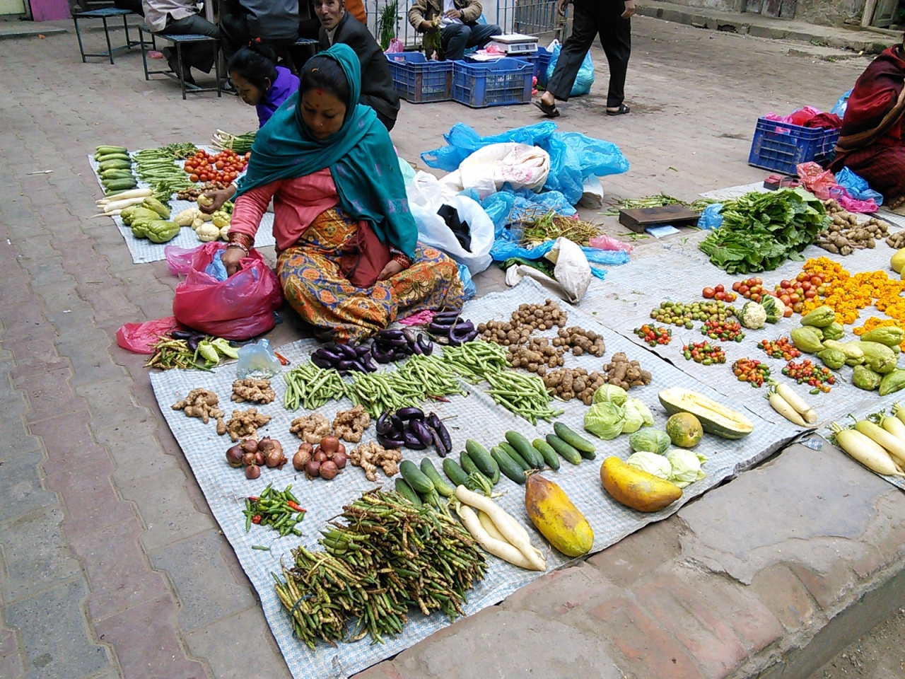 チェトラパティチョークの西側民家の間の空き地でおばちゃん達が野菜を売っています。昼間はおらず朝夕のみですが夕方のほうがおばちゃんの数が多いです。アサンチョークやタヒティーチョークのものより小さく市場と呼ぶ規模ではありませんが近所の人達が買いに来ています。