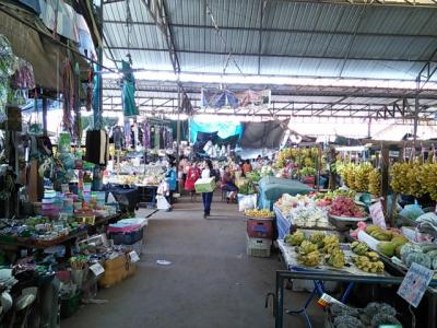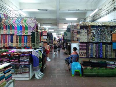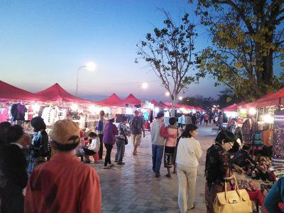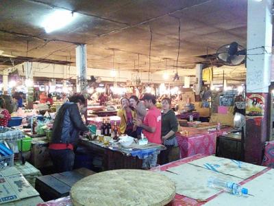 メコン川近くのファーグム通り沿いで毎日開かれています。かなりの規模ですが衣料品が中心で他にお土産になりそうな民芸品、アート作品などもありました。食事のできる店はなく、おつまみ程度のものがマーケットの端で売られているだけです。