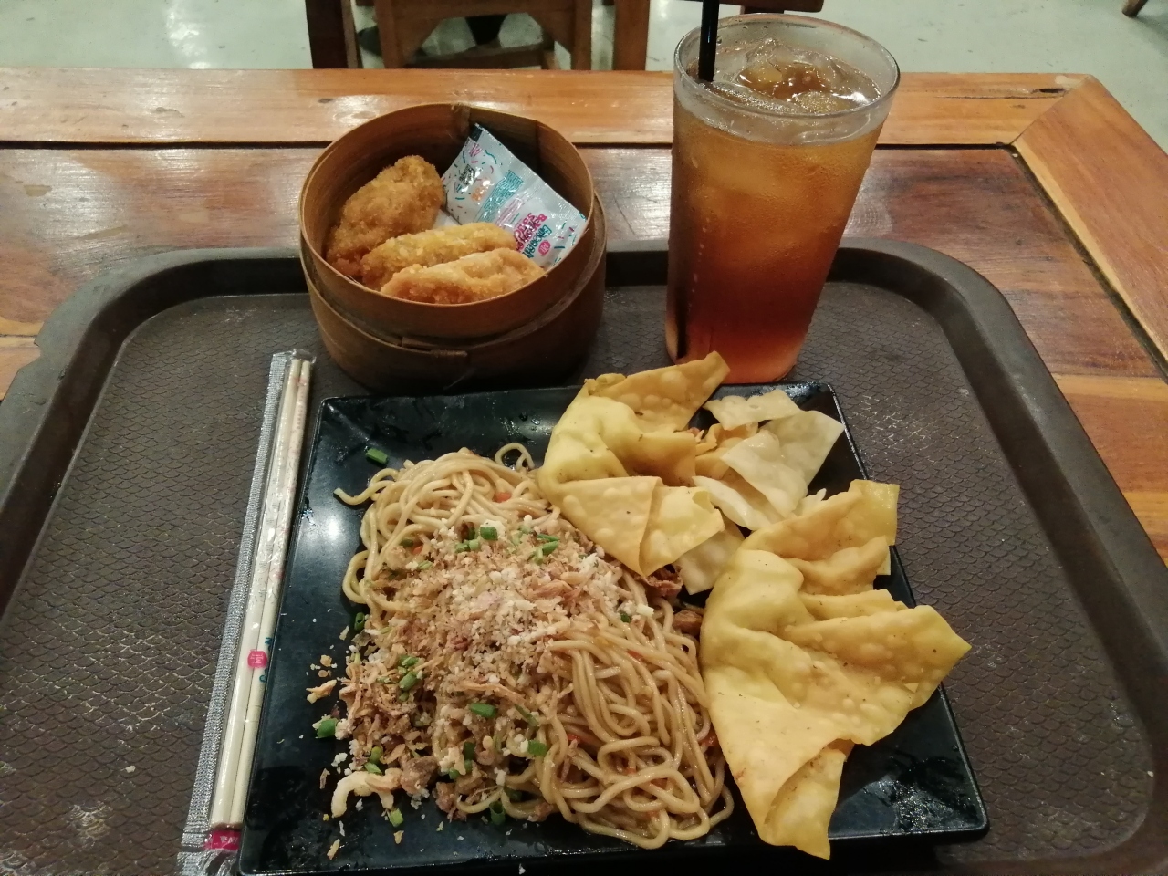 麺料理と点心が低価格で食べられる大人気チェーン店です。外観、店内はおしゃれで明るく、おじさん1人で行くにはちょっときつい雰囲気。注文の仕方がよく分かりませんでしたがスタッフが丁寧に教えてくれました。注文したのは「Mie Gacoan Lv2(10,000Rp)」※辛さのレベルが選べます。Lv0(マイルド)〜Lv8(超激辛)の9段階。多少辛い方がいいかなと思いLv2にしてみました。そして「Udanh Keju(8,600Rp)」、エビのすり身フライです。「Es Teh(4,100Rp)」。Tax10%かかり、計25,000Rpでした。