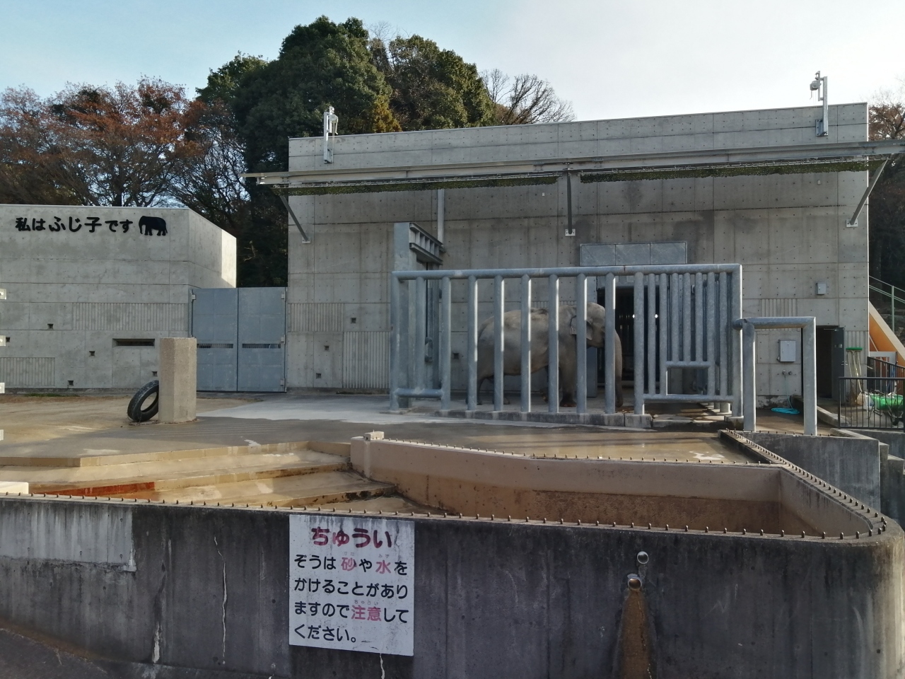 訪れたのは14:30頃。しかし「本日の展示は終了しました」の表示があり、象のふじ子は檻の中。HPでは15:30までと描いてあったのにどういうこと?スタッフの方に問い合わせると、高齢のため治療などもあり展示が制限されているようです。月水土は外には出ないそうです。檻の中にいるか背後の窓からは見られる時もあるようです。それ以外の日は基本的には外に出ますが、昼過ぎくらいには中に入ってしまうこともあるようです。
