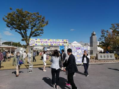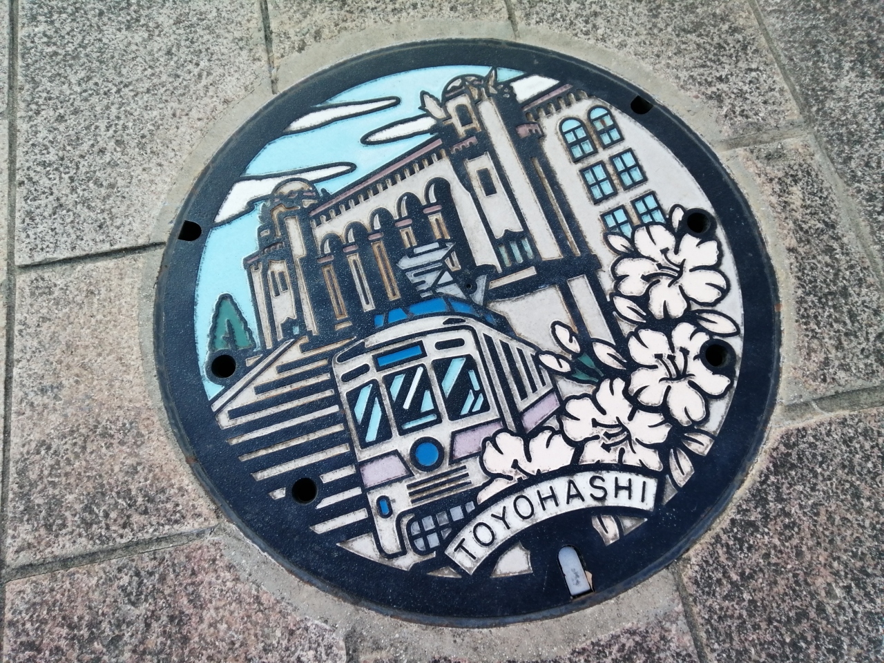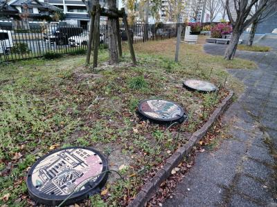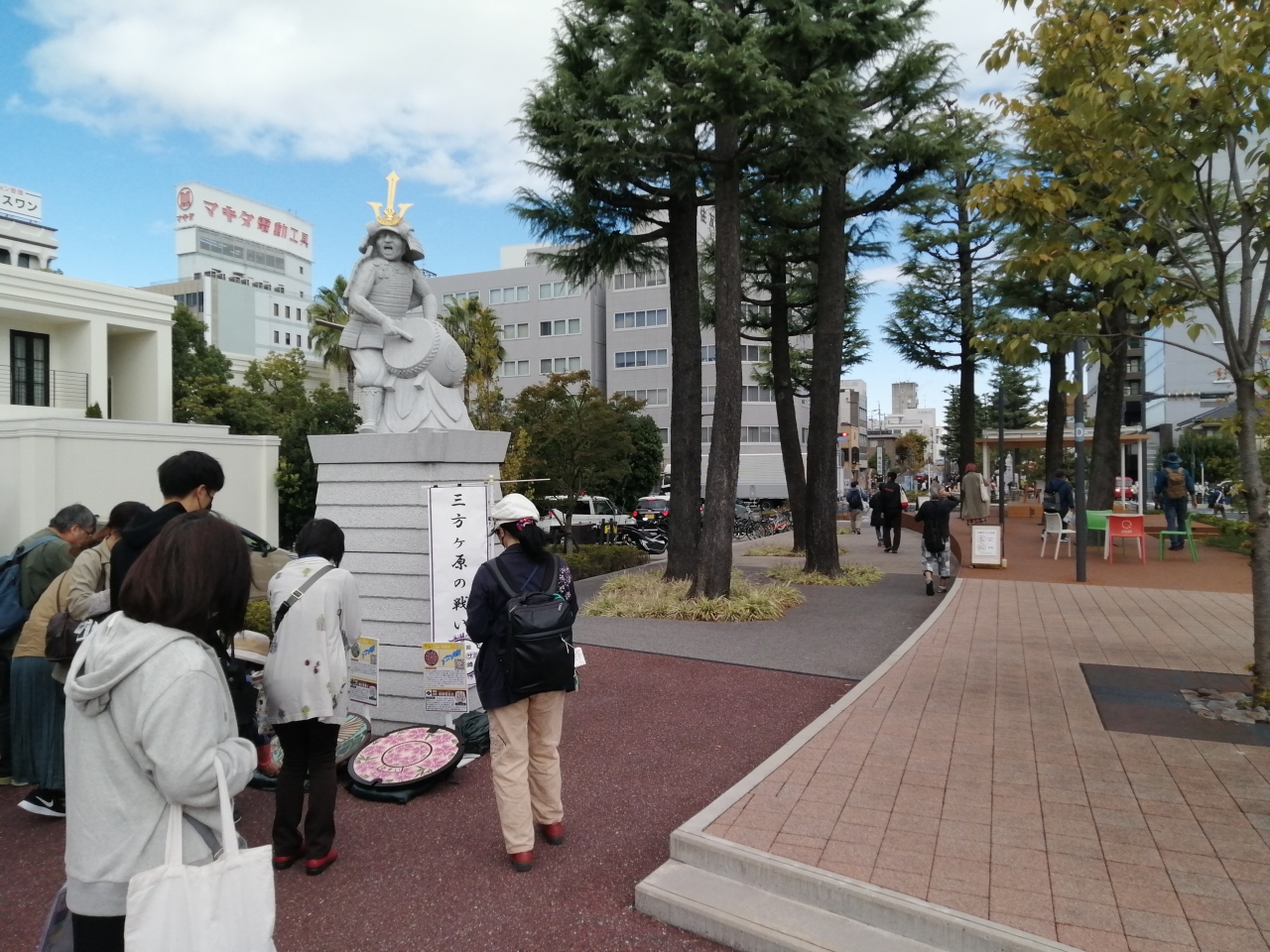 マンホールカードをもらうために訪れました。豊橋市が配布しているのは全3種、その内の1種がもらえます。1階の案内所でその旨を告げてあっさりゲット。建物を出た先の花壇に実際のマンホールの蓋があると聞いたので行ってみると…確かにありました。しかも全3種揃い踏み。しかしマンホールに設置されているのではなく、いわゆる。うーん、3種類見られたのはいいんだけど、これじゃないんだな。実際のマンホールが見たいんだな。やや残念…。
