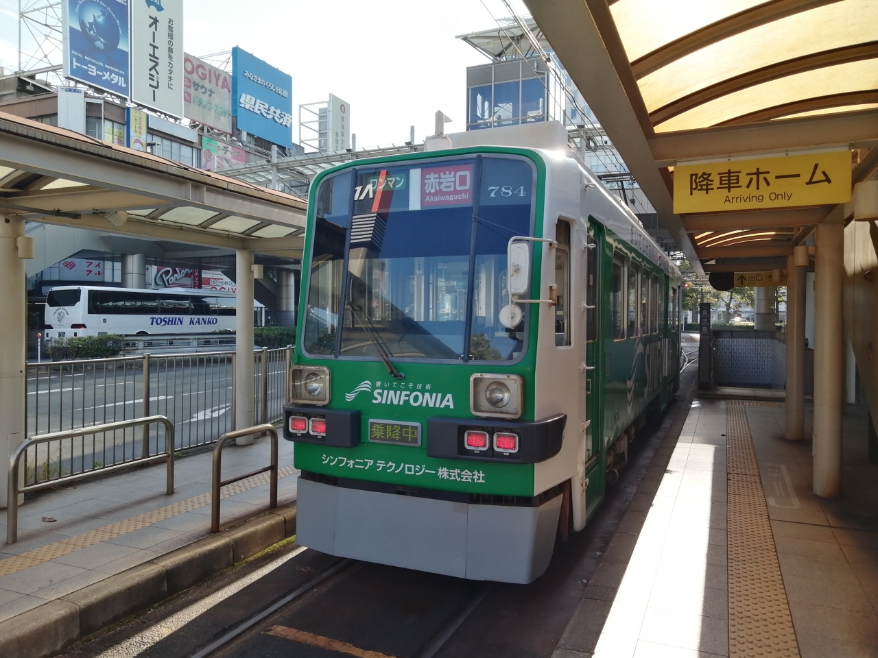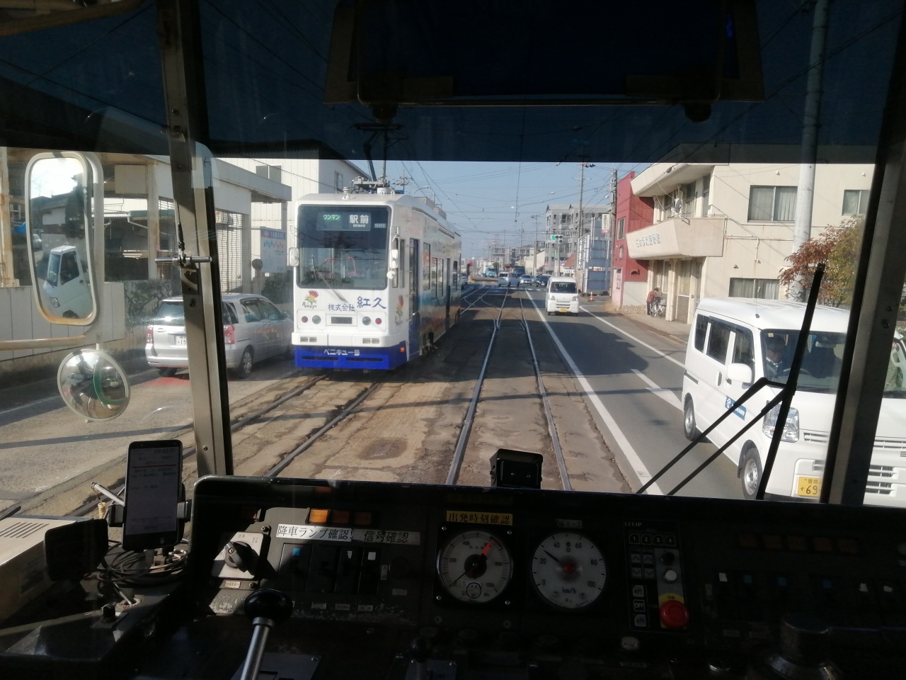 いわゆる“ちんちん電車”、いや今は路面電車というんでしょうか。豊橋のものは今回初めて乗りました。始発の「駅前」から終点の「赤岩口」まで。所要15分ほど、運賃は1乗車一律180円、もちろん“IC”対応です。通勤通学のピークは過ぎた時間でしたが乗車時は満員、しかし下車時では私を含めたったの2名でした。