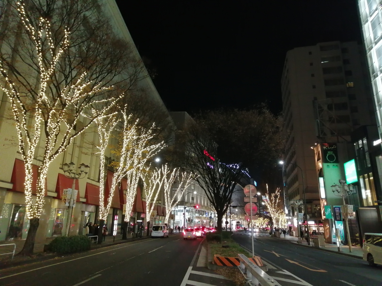 12月のとある日の夜、中区栄の大津通りをぶらり。街路樹にはシャンパンゴールドのイルミネーションが…。いや〜とてもきれいでロマンチックな雰囲気。冬の風物詩となっており、毎年色も変わるようです。クリスマスにカップルで行ったら盛り上がること間違いなしのスポットだと思います。