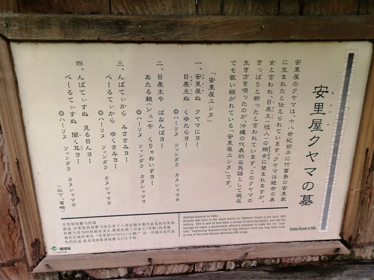 八重山地方を代表する民謡「安里屋ユンタ」に出てくる安里屋クヤマの生家です。クヤマは300年ほど前に竹富島に生まれた絶世の美女。下級役人の求愛を拒み、より位の高い役人に嫁いだことで知られています。美しいだけではなく、働き者で島の貧しい家の子供たちの面倒を見た聖女としても伝えられています。