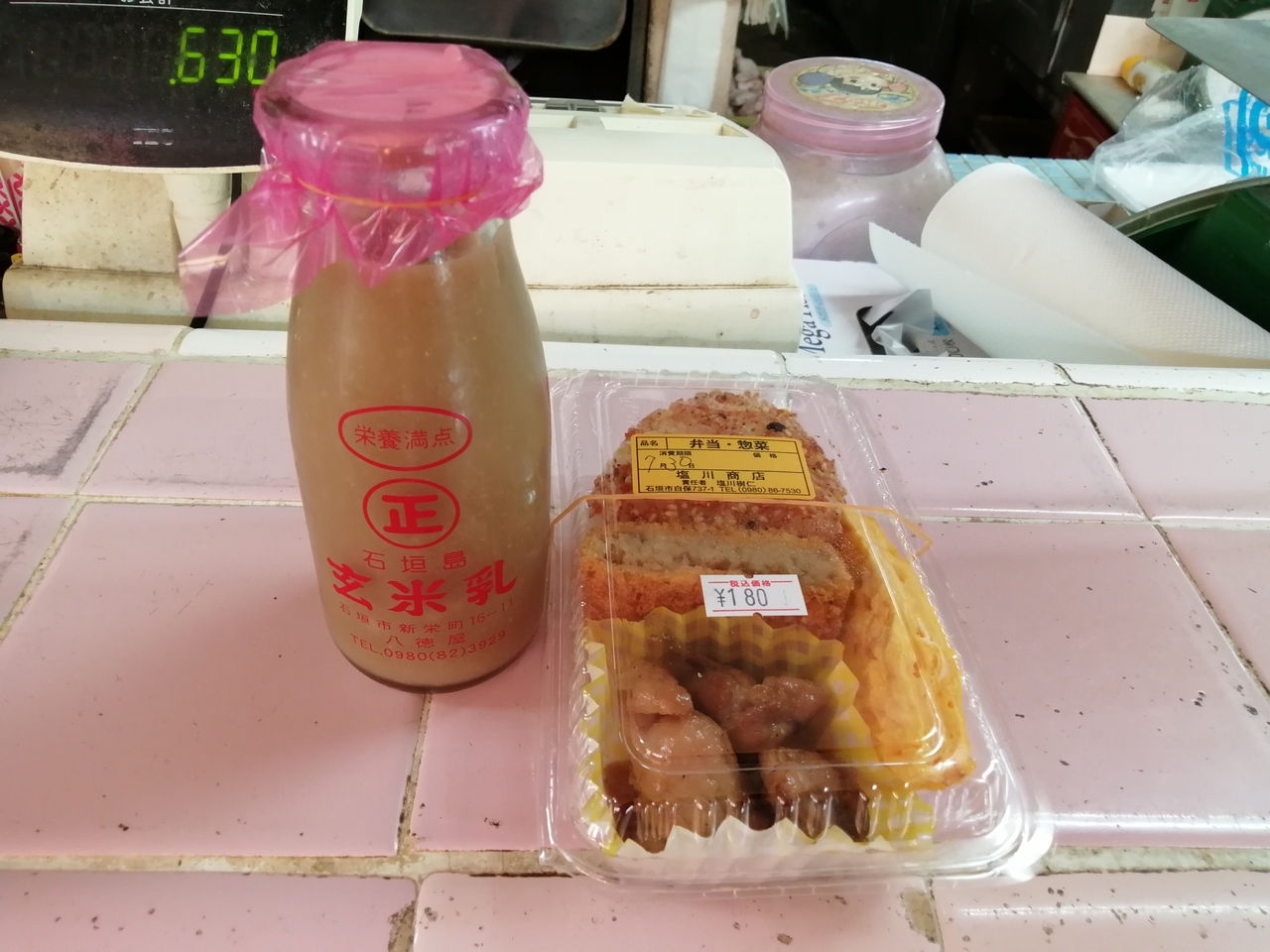 白保地区の住宅街の中にある商店です。お弁当類が超充実。入口に貼られていた「販売再開致しました 石垣島玄米乳」が脳裏から離れず、ミニお弁当と共に購入してみました。てっきりコーヒー牛乳の類いかと思い、フタを開け、腰に手を当て一口…。一口……。あれ出てこない。一瞬、傷んで固形化してしまっているのかと思いました。実はコレ、ドロドロの半液体の飲み物。いや食べ物といってもいいレベルの物質。お味はまるで「青柳ういろう」の“クロ味”そっくり(分かる人には分かると思います)。いや~石垣島にはこんな飲み物があるんですねぇ。ビビりました。ちなみに飲み切るために自由落下でブツを落とすには結構な時間上を向いていなければいけません。首、結構ヤラれます。お値段1本190円。なかなかの代物です。