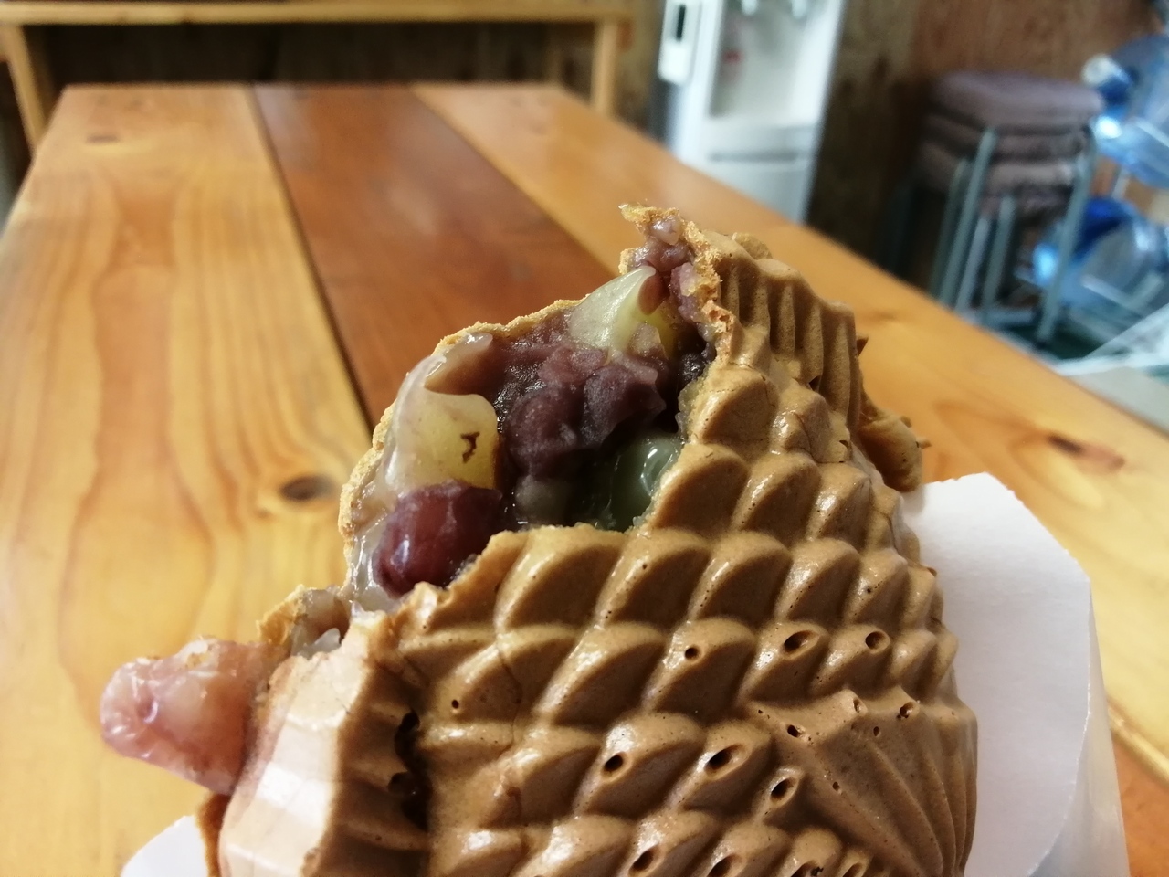 焼きたてのアツアツです。皮は薄くサクサク、あんこはたっぷり。チーズは完全に溶けきっておらず、“つぶ”状態でした。とってもおいしいです。ただ、あんこがかなり甘さを抑えているのでチーズの風味に負けてしまっているかなと。もう少し甘ったるさがあってもいいかなと思います。- 旅行時期