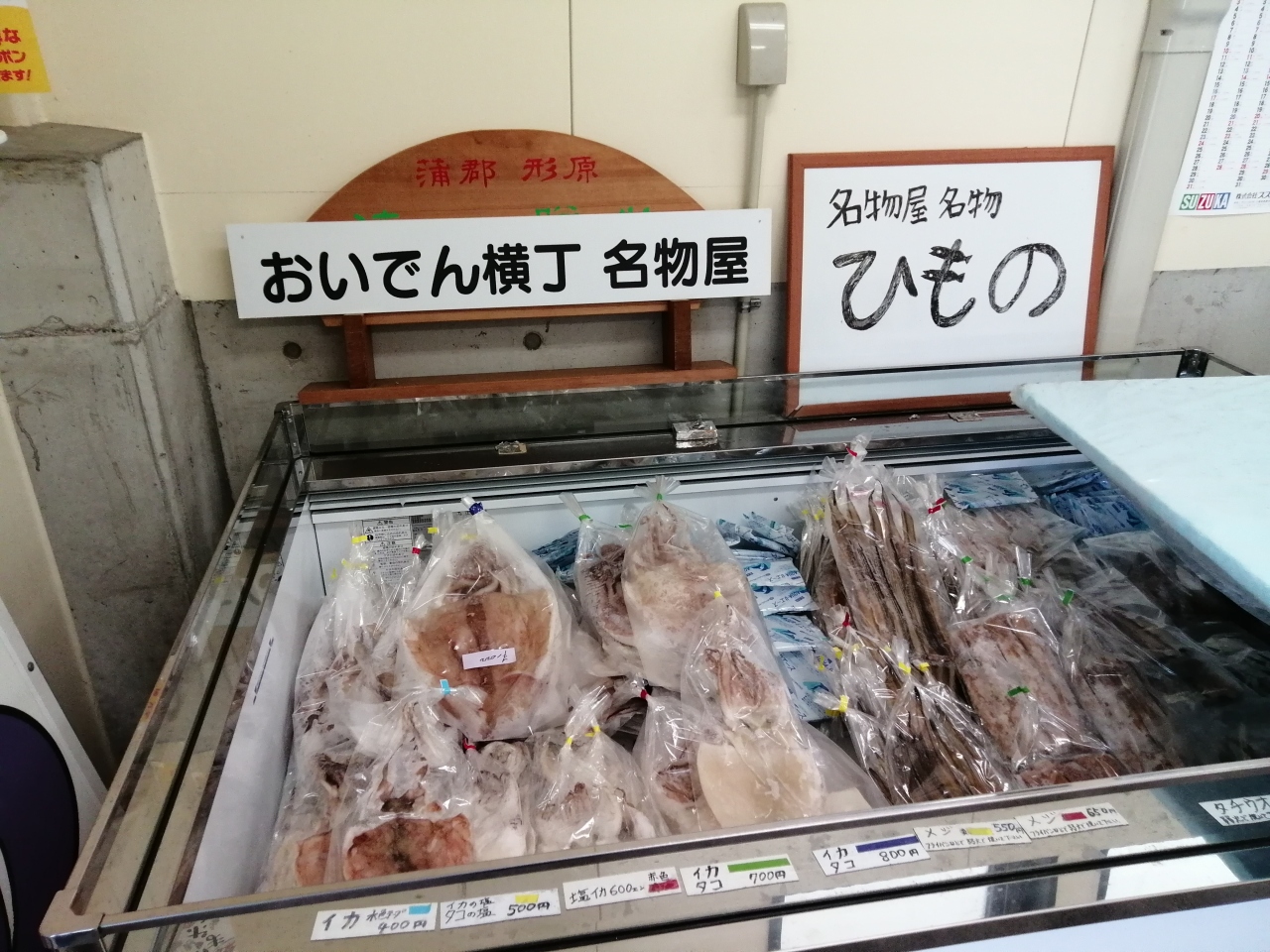 テレビ番組でもよく取り上げられる有名店のようです。店内には訪れた有名人の写真とサインも多数飾られています。近くの形原漁港でその日に水揚げされた新鮮なイカやタコ、エビなど加工し、天日干しにして焼きあげた「べっこう姿焼き」が名物ですが、今回はいかの干物にしました。大きさによって値段が変わりますが、一番小さいサイズ(500円税込)にしました。冷凍されており、ちゃんと持ち帰りように保冷剤を入れてパッキングしてくれました。これをアテに日本酒をやるのを想像するとじゅんじゅわ〜って感じです。