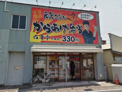 名鉄宇頭駅前にある、からあげ弁当屋です。周りに目ぼしい飲食店がないので存在感がありますが、それにもまして派手な看板が目立ちます。「からあげ弁当330円」という文字に惹かれて立ち寄ってみました。もちろん看板にある「元気こぶしからあげ弁当(税込330円)」をオーダー。