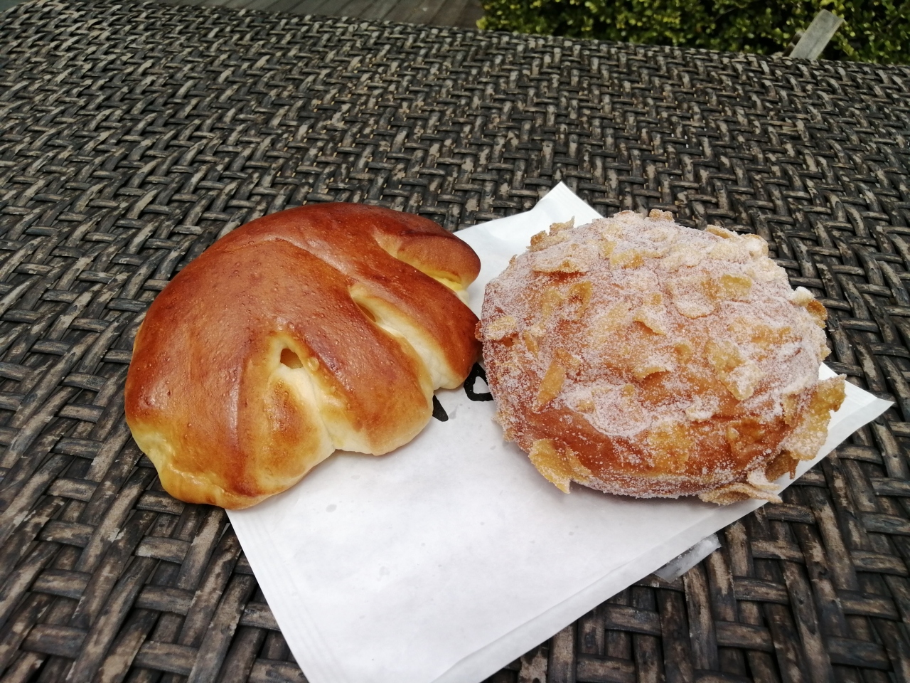 なんかものすごく有名で流行っている店のようです。1時間で食パンの売れた数がギネス記録にもなっているそうです。パンの種類は常時120種類とか。なんかこういう店は苦手なんですがものは試しで行ってみました。激混みを覚悟していましたが、平日の午前10時だったためか客は4〜5人。ストレスなく買えたのでホッとしました。買ったのはこの店2番人気の「トラのクリームパン(税込160円)」と珍しかった「フレークドーナツ(160円)」。クリームパンはロットの差によるものか焼き具合が違うものが混ざっていました。種類を多く作るより、1つのパンをもっと丁寧に作ったほうがいいと思うんですが…。まぁ、おいしいとは思いますが、これが120種類の中の2番ですか?という感じ。ドーナツは中にカスタードクリームが入っていました。クリームパンと同じものかな。まさかのクリームかぶりにちょっと損した気分になりました。少しは予習してから行ったほうがいいですね。