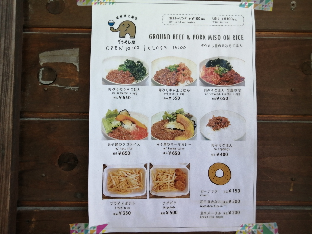 愛知県西尾市に本店がある「ぞうめし屋」の岡崎東公園内にあるテイクアウト専門の売店です。岡崎東公園内の動物園には象がいるので、おそらくそこを狙ったんだと思います。