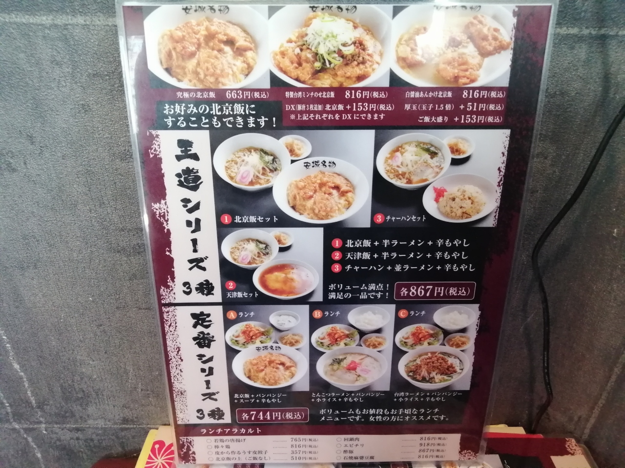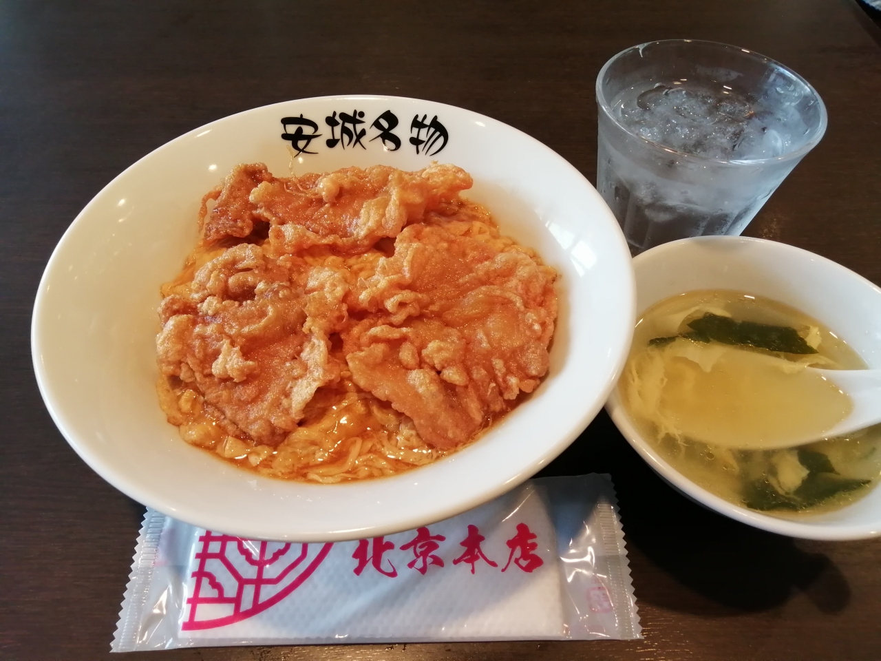 これが噂の北京飯ですか…。玉子丼の上に唐揚げが3枚。玉子はトロトロでしっかりと味のある醤油ベースのタレがかかっています。まさに私好み。唐揚げは鶏ではなく豚肉でこれまたうまい!玉子スープがついてこれでお値段663円(税込)。納得の値段。というかかなりお得だと思います。大満足。中華の店なので他にもいろいろメニューがあります。