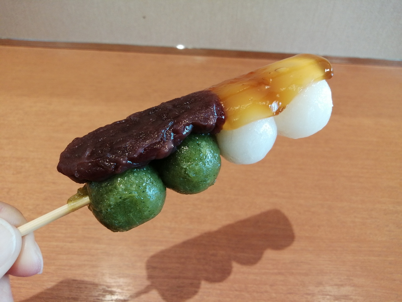 目に止まったのが、みたらしと草だんごがハーフ&ハーフになった「よくばり団子(税別100円)」。白いだんごにみたらしのたれ、草だんごにはつぶあんが乗っかっています。1本で2度おいしい、とってもお得な一品だと思います。- 旅行時期