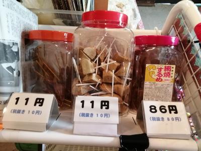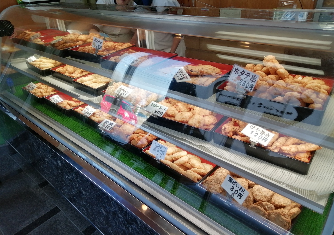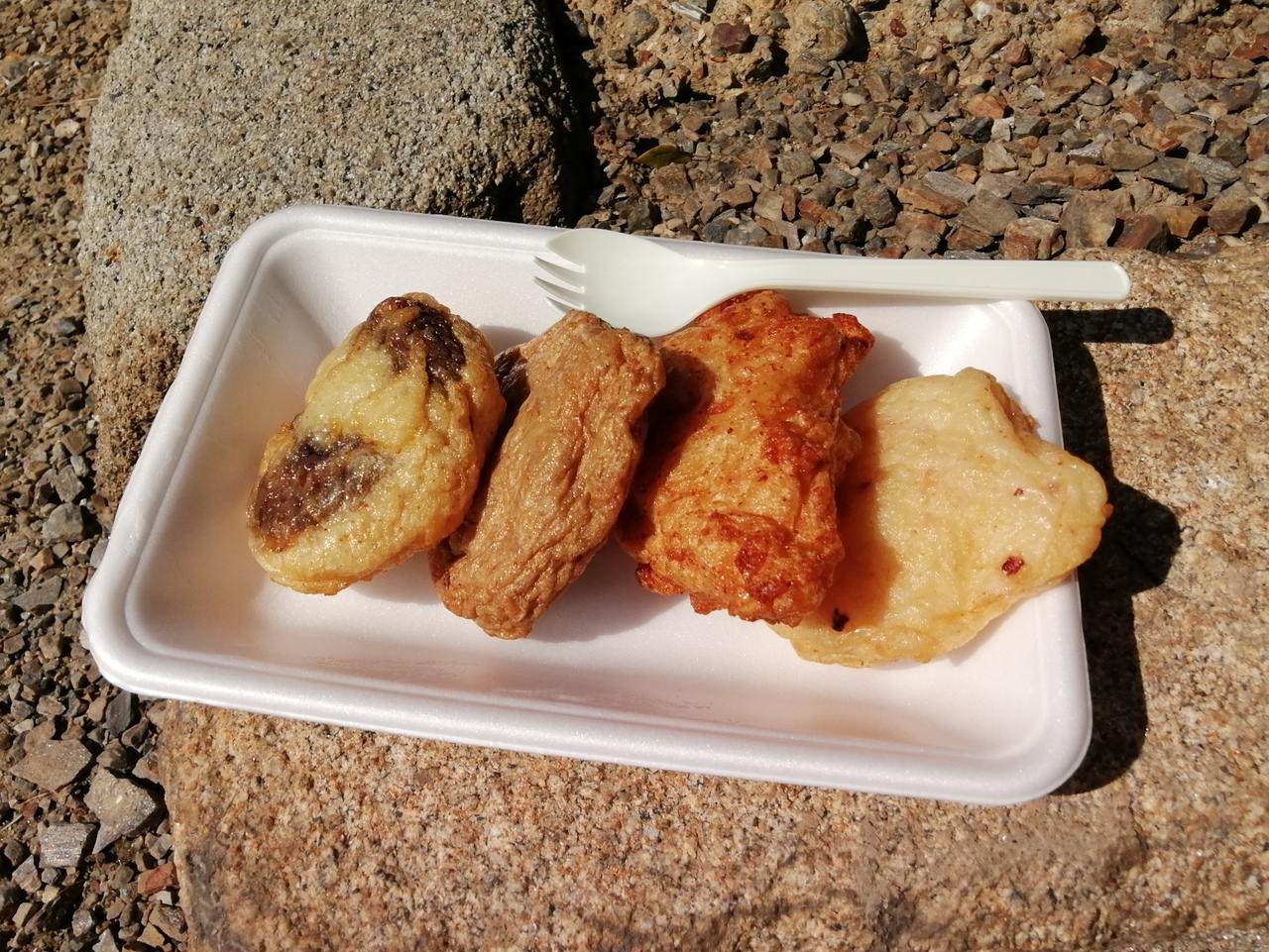 妙にそそられる店ではありませんか。名前のとおり、練りもの系の専門店です。驚くのはその種類。どれも気になる物ばかりで1回では買いきれません。泣く泣くチョイスしたのが…(写真左から)しいたけ(120円)、揚げいわし(80円)、ポテト(120円)、いかぶつ(80円)の4種。