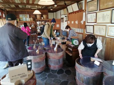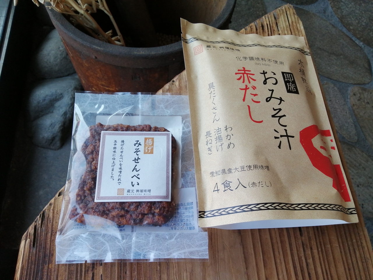 店内には桶に入れられた味噌がずらり。さすがに味噌を買うのは…ということでインスタントの味噌汁と味噌せんべいを買ってみました。味噌汁はもちろん八丁味噌の赤だしです。自宅でいただきましたがうまい!いつも飲んでいる12連の安物とは比べものにならない質の高さです。せんべいは五平餅風の味なのですが、なんかねちゃついて歯にくっつく…。食感がいまいちです。それと裏側には味噌は塗られていません。決して意図したのではないと思いますが、裏側は成分表示などで隠れて見えないようになってます。味噌せんべいはあまりおすすめできません。- 旅行時期