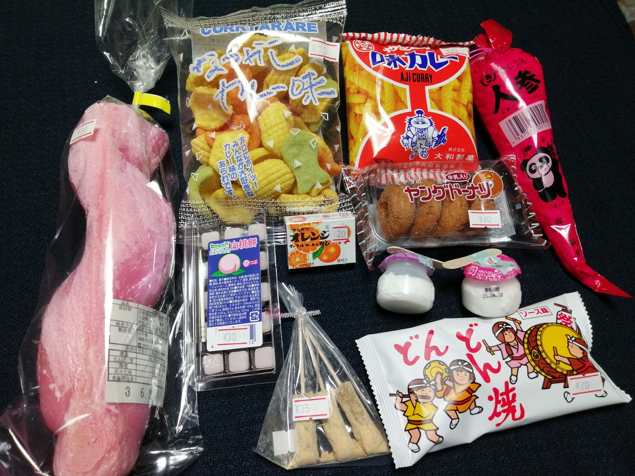お目当ての「どんどん焼き」とちっちゃなカップの「ヨーグル」、「人参」をゲット!その他写真の品を買って合計351円でした。懐かしい味、そしてうまい!カレーあられは食べ出したら止まらない。一瞬でなくなりました。- 旅行時期