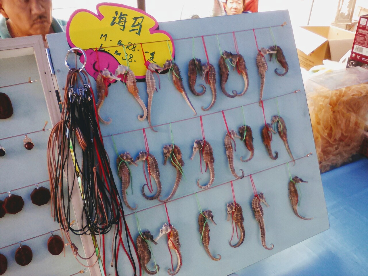毎週日曜の午前中にガヤストリートで開かれる露店マーケットです。野菜や果物から衣類、おもちゃ、アクセサリー、骨董品、植木、工具、ハムスターなどのペットたち、その他生活雑貨などなど…。ごちゃまぜ感が半端ありません。人出も多く賑わっています。数ある中から私の注目の一品は…タツノオトシゴの携帯ストラップ!多分本物だと思います。Mサイズで28RM(約725円)。別に携帯に付ける必要はありませんが…。というかすぐ壊れそうだし、携帯傷つくし。そもそもこんなもん、ワシントン条約違反じゃない?日本に持って帰れないかもしれません(見つかればですが…)。あしからず。