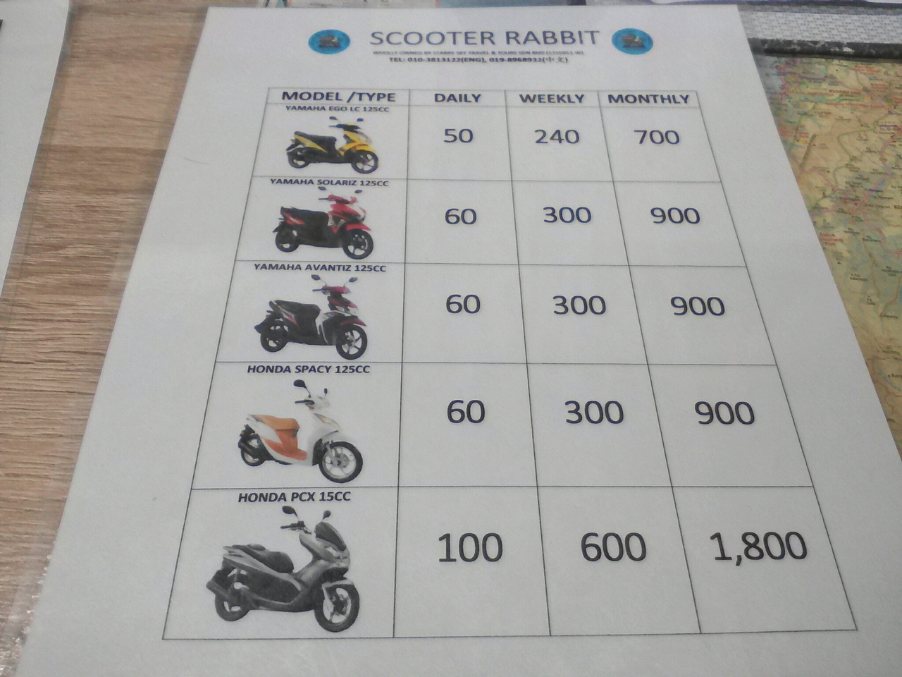 場所は「Suria Sabah」ショッピングモール南隣りにあるビル「Wisma Sabah」1階です。スクーターと電動自転車が借りられます。スクーターはピカピカのホンダとヤマハ、種類により料金が変わりますが1日(24h)50RM~。料金表は写真を参照して下さい。パスポートと運転免許証(国際、日本どちらも可)が必要。免許証は現物が無くてもその写真だけでもOKです(日本から写真をネットで送ってもOK)。ヘルメット、レインコートは無償貸与。バイクの車両保険は付いていますが怪我などは付いてないということです。
