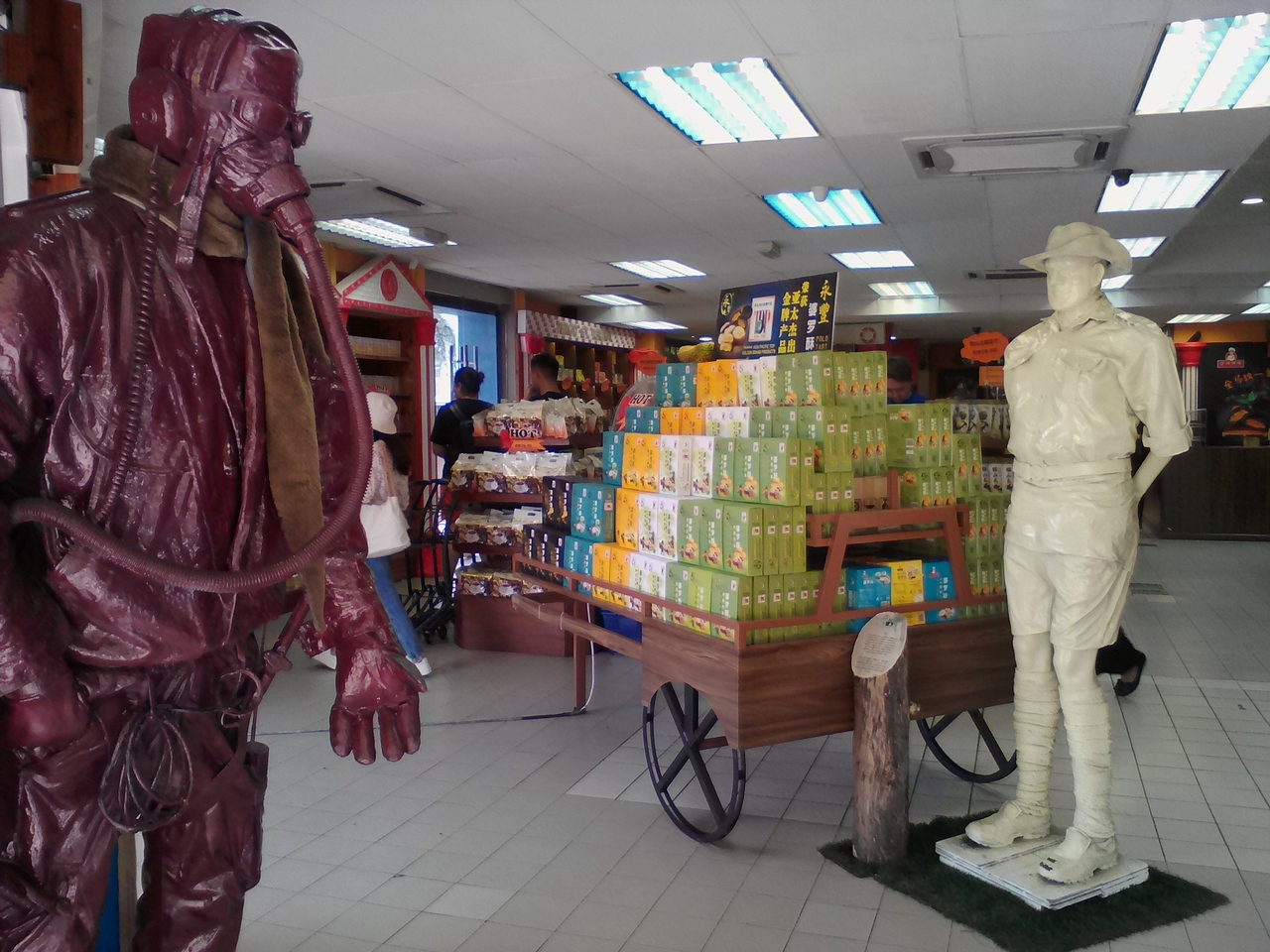 ガヤストリートにある土産物屋。観光客かをタクシーやツーリストバスでやって来るような店です。お菓子類の定番のお土産が揃っています。ドリアン、マンゴスチン、ライチなどのフリーズドライのお菓子、各種フルーツチョコ、コーヒー、紅茶、ツバメの巣クリームやパックなんかもあります。フリーズドライやチョコは試食ができるのでハズレなく買うことができます。入口ある意味不明の人形は何なんでしょうか?