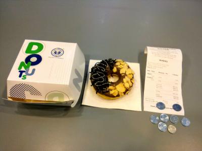 スリアサバの地下にもあります。普段このような店には行かないのですが、ものは試しに食べてみました。ドーナツの種類は多くてとってもカラフルです。一番シンプルな定番の「Classic」にしようと思ったのですが値段はどれも同じ3.6RM(約93円)だと。値段設定おかしくないですか?だったらチョコとかナッツが乗ってる方がお得じゃね?という貧乏根性が自動的に働き、一番豪華そうな「Al Moon」にしてしまいました。どんなドーナツなのかは写真参照。たった一個を店内で食べるのにわざわざ箱に入れるなんてもったいない…。お味はもちろんおいしいですが、自分にとってドーナツ1個で3.6RMはやっぱり高いと感じます。