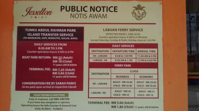1島だけを訪れる場合は往復23RM、2島(33RM)、3島(43RM)、4島(53RM)、別途ターミナルフィー7.2RMがかかります。島から島の移動料金も含まれています。入島税がかかる場合もあります。シュノーケルセットなどは有料で借し出ししています。