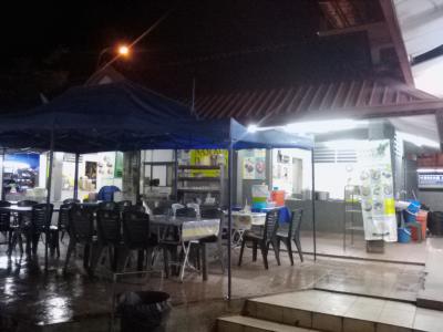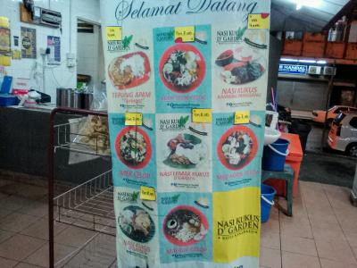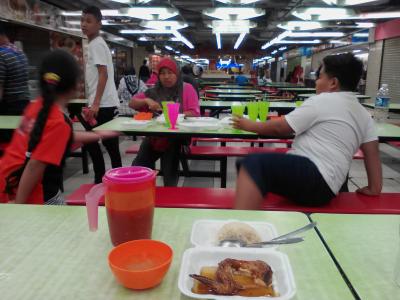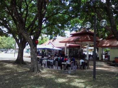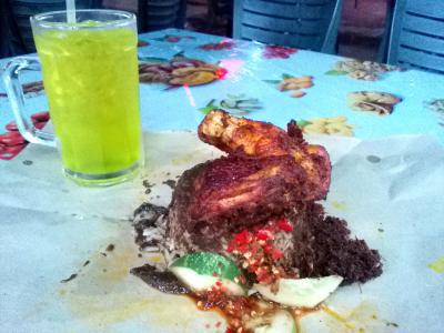 Jalan Tuguの市庁舎、裁判所の並びの南側にある公園の一画にあります。メニューはいくつかありますがもちろんナシククスをいただきます。ナシククスとは蒸して作ったご飯のこと。フライドチキンなどと一緒に食べます。このセットで8RM(約207円)、ご飯の上にフライドチキンがドーンと乗っかっていてなかなかインパクトがあります。カレーソースやサンバルの違いがそれぞれの店の特徴になります。ここのは…やはり辛い。ローカル仕様だとどこも辛めですが、けどうまいです。ご飯の足りない方はおかわりもできます(2RM)。緑色したシロップジュースは無料で飲み放題です。ただの砂糖水だと思いますが色的に青リンゴジュースの味がしてしまうのが不思議です。人体の神秘です。