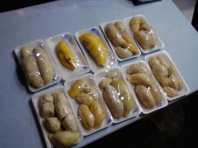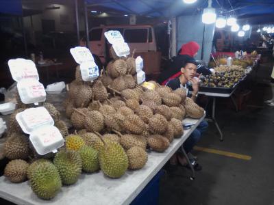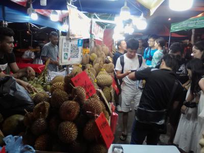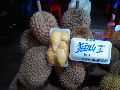 ドリアン屋台が出現するのは17:00頃から。辺り一面なんとも言えない臭いが漂います。ドリアンは種類によってかなり値段が違います。最高級品の「猫山王」は1kg60RM前後します(時期により変動します)。安いものは1kg8RM。猫山王のやや小ぶりで中身が4房のもので80RM(約2100円)でした。その場で解体して実を取り出してくれます。そもそも日本ではほとんど食す機会はないと思いますが、断然こちらのほうが安く食べられます。1人では食べきれない(持ち込み不可の宿がほとんどです)とお悩みの方、安心してください。ちゃんと小分けにしてパックされた物も売られています。これなら安く少量を食べられます。