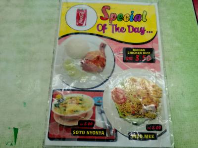 Center POINT Sabahの地下のフードコートのような一画にあるにあるチキンライスの店。派手さはないドローカルな雰囲気ですがなかなか流行ってます。その理由は安さ。「RAIHAN CHICKEN RICE」3.5RM(約91円)。当然、量は少なめで発泡容器に盛られて出てきます。メニューの写真と違うのはご愛嬌。けど味はなかなかおいしいです。一般男子はこの量では物足りないかなと思います。ライスのおかわりは2RM。ふつーやん。1RMでがんばってほしかったー。安いことはいいことですが2度目を行くかは微妙なところです。テイクアウトは4RMになります。