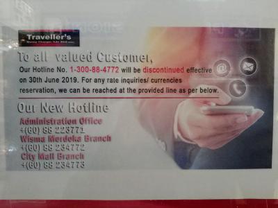 ちなみにこの日のレートが1B$→3.035RM。ここで注意が必要です。どこも似たようなレートを表示していますがこれは100B$札でのレート。50B$札以下のレートはぐっと悪くなります(窓口の隅にちっちゃく書かれています)。しかしこの「Traveller's Money Changer」はどの額面の札も表示レートで両替してくれます。この店だけです。コインは不可です。ちなみに他店の50B$札以下のレートは2.80〜2.95でした。Wisma Merdeka以外では2.70の所もありました。
