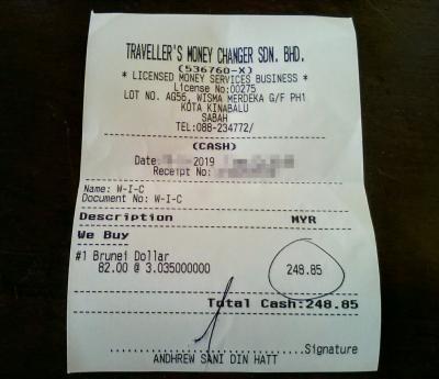ブルネイ・ドル(B$)をマレーシア・リンギット(RM)に両替しました。すべてのマネチェンで両替できますがおすすめはWisma Merdeka1階にある「Traveller's Money Changer」です。同じフロアには10店ほどのマネチェンがあり、場所は説明しにくいのですが北隣りのWisma Sabah側(Lot No.AG56)です。