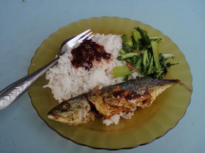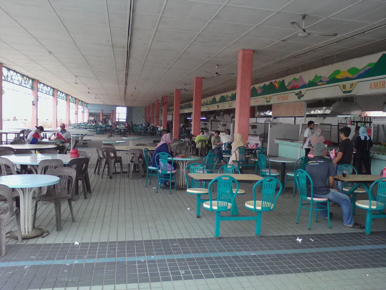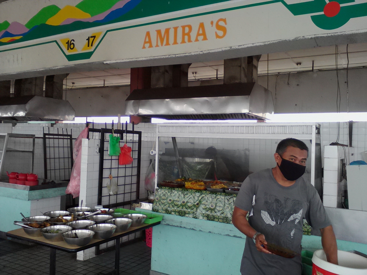 メルデカ広場西側のビルの屋上にあるフードコート。ビルと言っても1階の周囲が店舗になっているだけの立体駐車場です。建物の両端に階段とエレベーターがあります。階数は5(日本式だと6階)です。屋上にたどり着くと驚かれるかもしれません。一見廃墟のようで営業している店は全体の2割ほど。寂しいかぎりですがこれがいつもの状態です。私の利用した店は南東角にある17番の「AMIRA'S」。普通の定食屋です。自分でご飯を皿に盛り、好きなおかずを乗っけるセルフサービスになっています。この店のウリは驚くべき安さです。一例を言うと、“ナス”と“豆腐とモヤシ”を乗っけてなんと2RMです。(ご飯1+おかず0.5×2)なのか(ご飯0+おかず1×2)なのか悩む値段設定です。別の日は焼き魚と青菜で3RM。もちろん味もとってもおいしいです。ちなみに他の店ではナシゴレン3RMです。ここで食べたら他で食べるのがアホらしくなるヤバいフードコートです。11:30頃開店、15:00頃が閉店です。