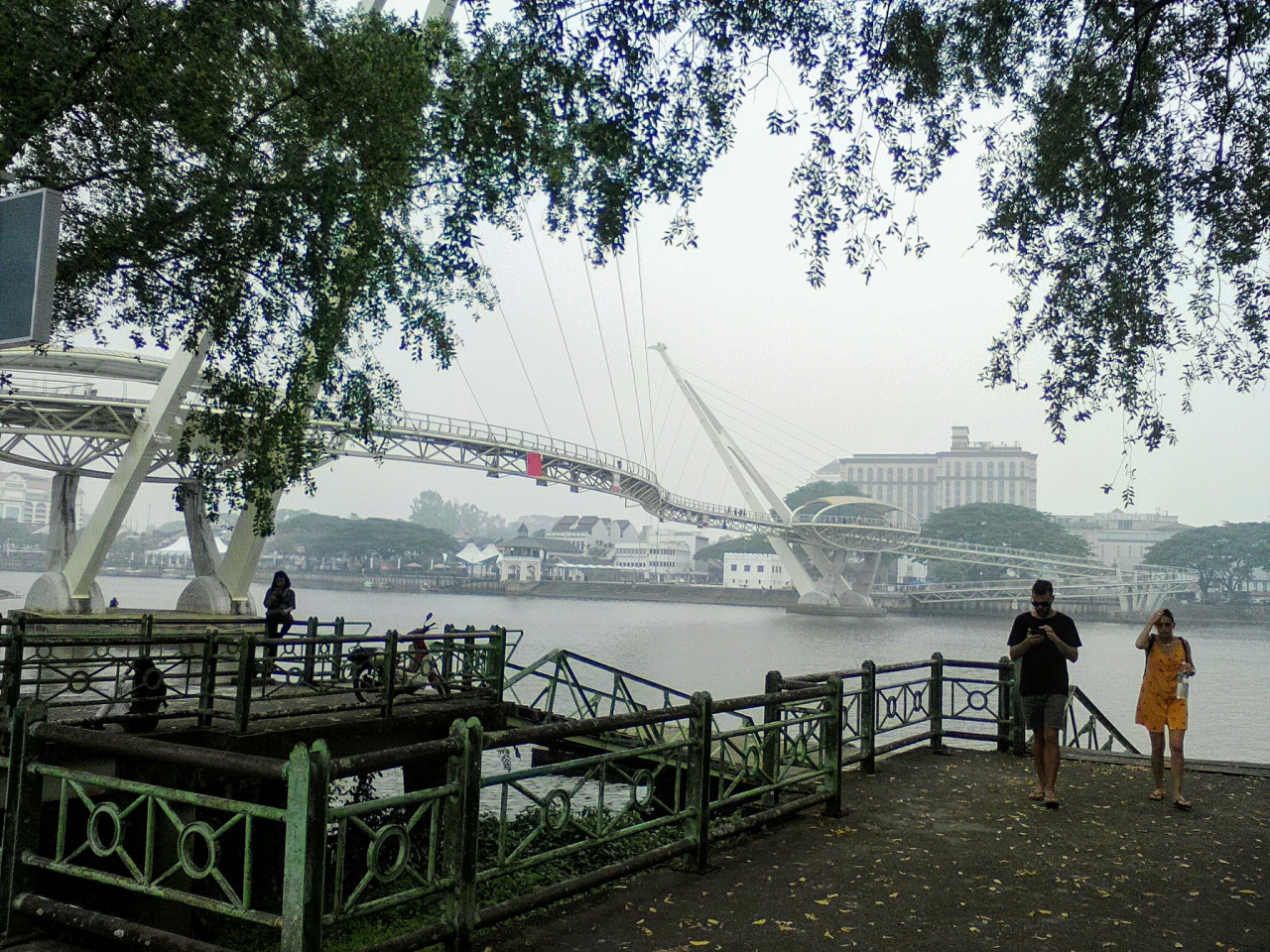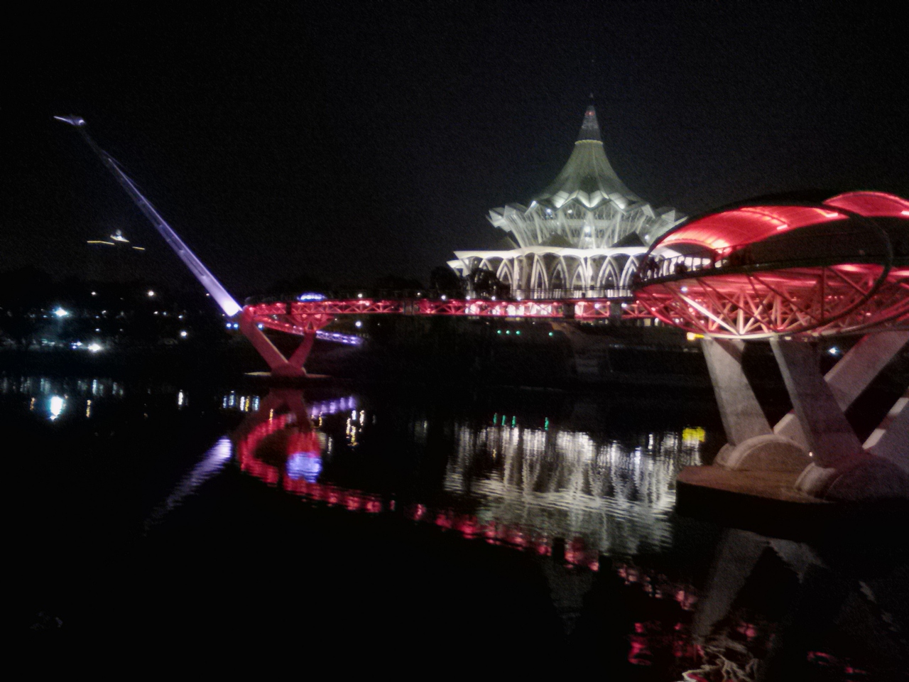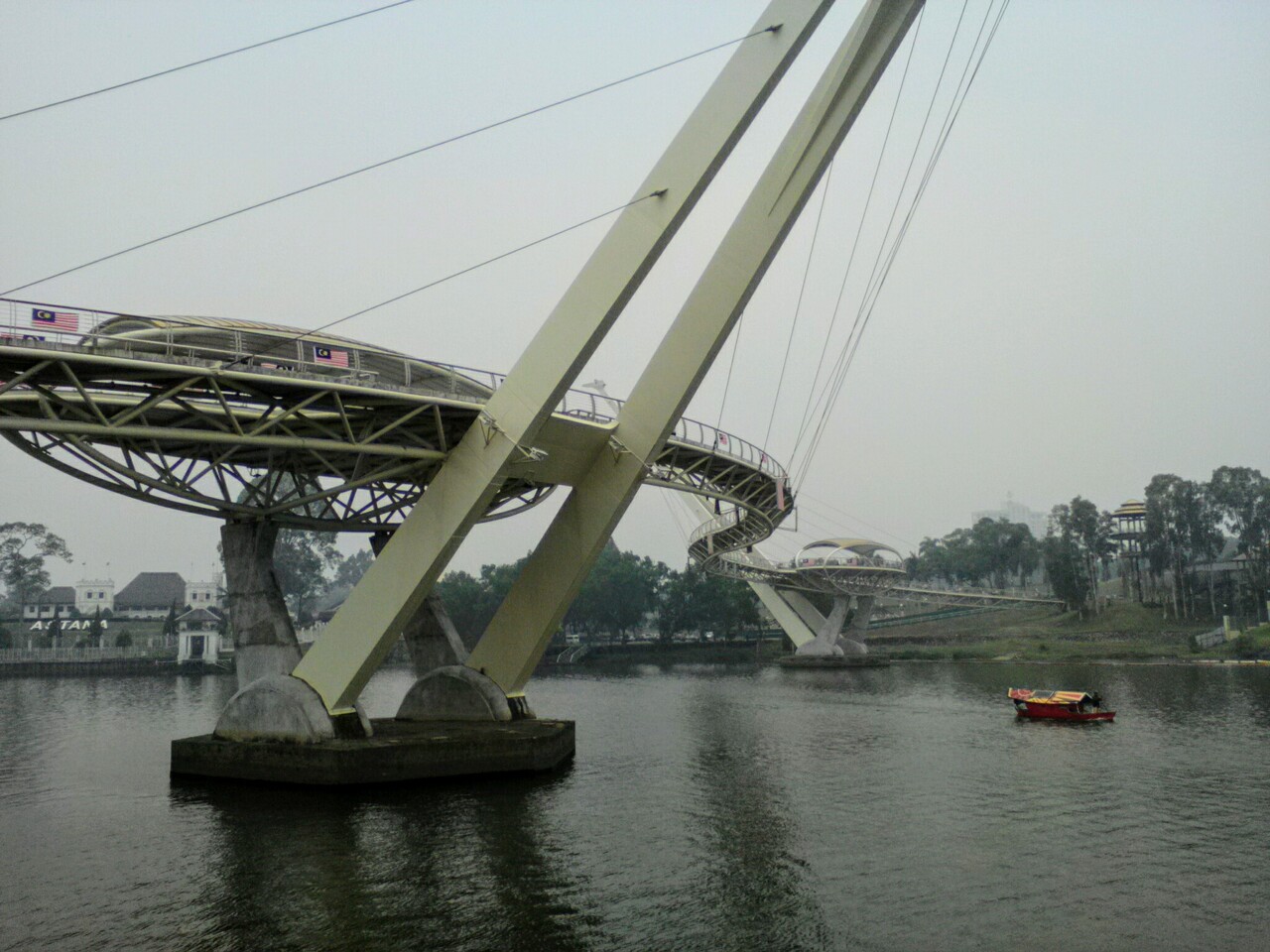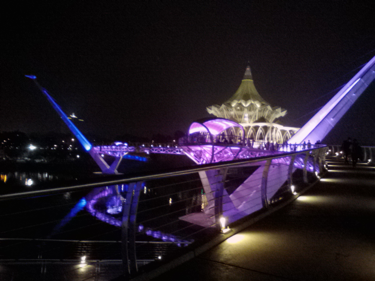 間違いなくクチンを代表する観光スポットの一つだと思います。ウォーターフロントの中心、州議会議事堂のたもとに2017年の秋に掛けられました。斜めに立つ2本の支柱に支えられた、らせんを描きS字に曲がるなんとも奇抜で優美な姿をしています。夜にはライトアップ、次々に色が変化します。写真撮影にはもってこいのクチンの映え映えスポットでもあります。
