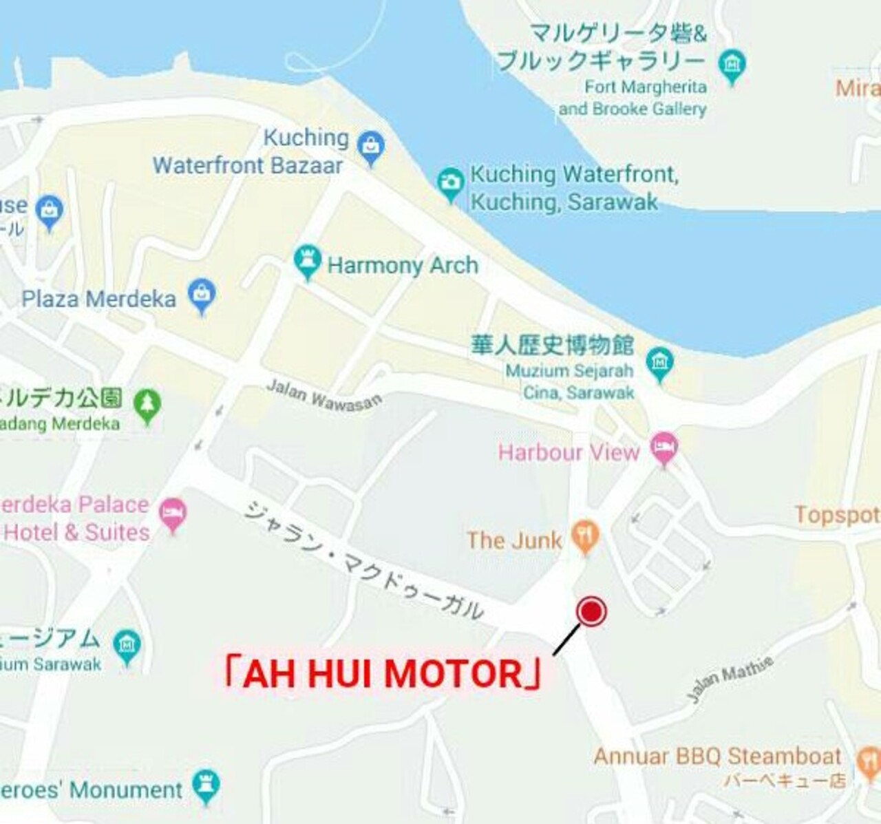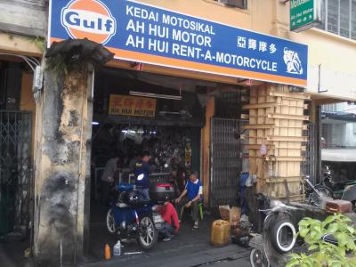名前は「AH HUI MOTOR」、場所は写真の地図を参照して下さい。125ccのスクーターが1日(24H)40RM(約1030円)、デポジット100RM(バイク返却後に返してもらえます)。パスポートと国際運転免許証が必要です。日本の運転免許証ではだめと言われました。バイクを借りるつもりの方は注意して下さい。