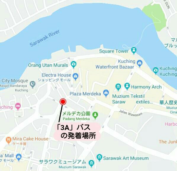 クチンセントラルへは市内のジャラン・マスジット周辺から発着する市バス「3A」で行けます。詳しくは写真の地図を参照して下さい。クチンセントラル真ん前のバス停に停まります(終点ではありません)。料金は2RM。市内に行くときは道路を挟んだ反対側の南行きの車線で待っていればバスは来ます(工事中なのでバス停なし)。