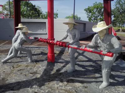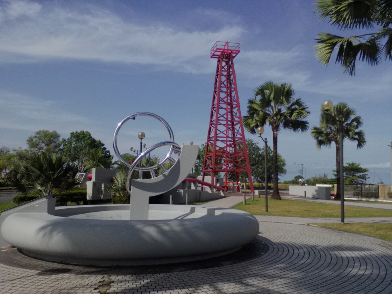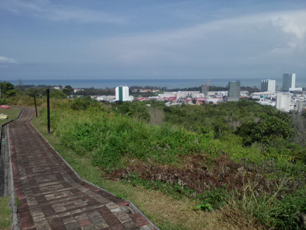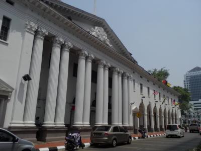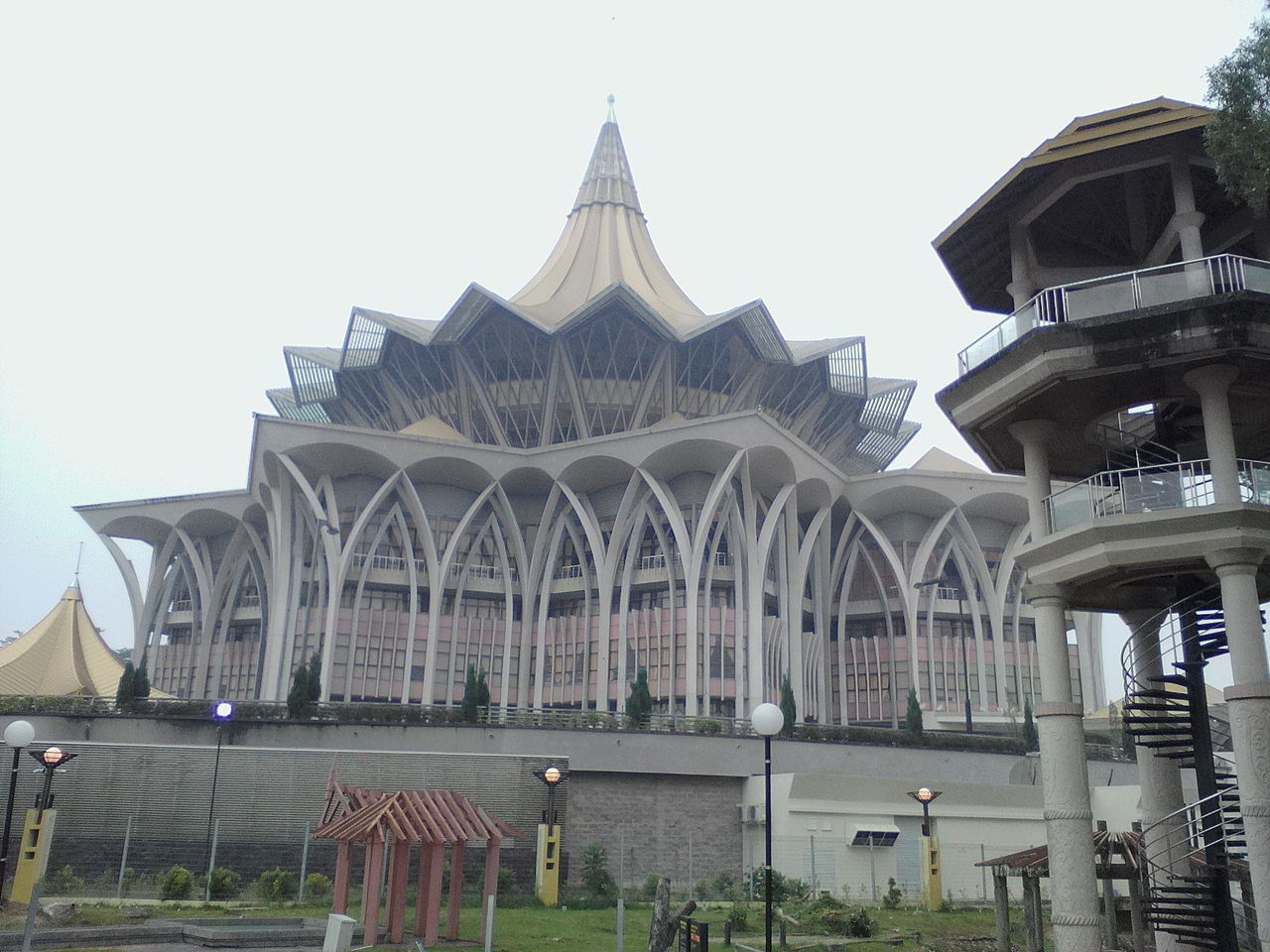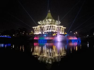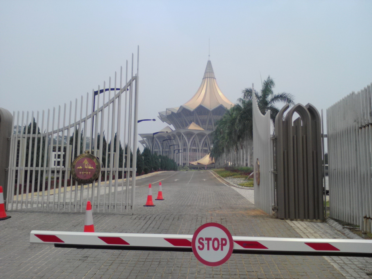 クチンの町で一番を誇る存在感、斬新なデザイン。初めて見る方は驚かれるかもしれません。夜はライトアップされ、毎日行われる“ライト&サウンドショー”の一部にも組み込まれちゃっています。橋の上から眺める方は多いと思いますが対岸に渡って見る方は少ないのではないでしょうか。ましてや正面ゲートまで行ってみる方はまずいないと思います。で、行ってみました。橋を渡った先を進めば自然にたどり着きます。敷地内に入る扉は開放されていましたがその手前に「STOP」と書かれたバーが…。さすがに入るのはやばいです。眺めるなら裏手にあたる市街側からの方がよさそうです。