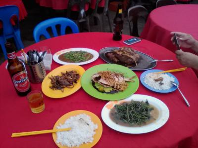 で、海鮮屋台に行ってみました。5〜6軒ほど並んでいて、どこも店先に魚介類が並べられています。客引きが激しいですが食材を見て新鮮そうな店にしました。基本、メニューはありませんがある店もあります。魚揚げ20RM、豚モツ炒め12RM、空芯菜炒め8RM、豚足(超デカい)25RMなどを注文。ビールはギネス20RM、アンカー15RM(いずれも大びん)でした。ライスは無料で付いてきます。1人では行きにくい所ですが、多人数なら楽しめると思います。- 旅行時期