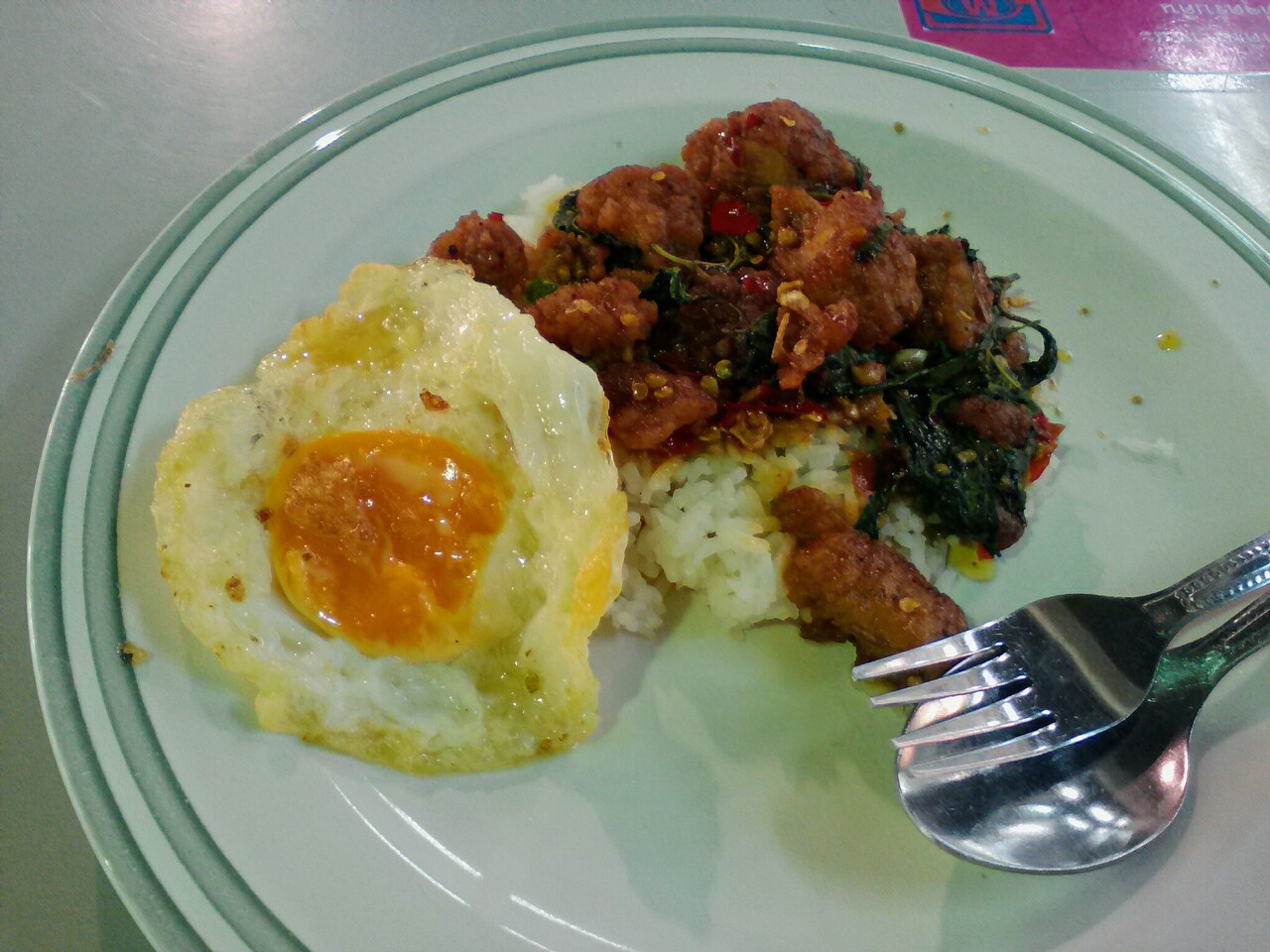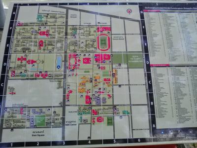 初めてチュラロンコーン大学に潜入してみました。もちろん目的は学食です。大学の場所はサイヤム・スクエアの南側。MBKのある交差点を南に800mほど行くと左手に池のある公園のような場所が現れます。おそらくここがメインゲート。ちなみに右手もすべて大学の敷地です。想像を越える広さです。構内配置図を見てみるといたるところに食事マークが…。かなりの数の食堂、カフェがあるようです。歩いていた学生とおぼしき方に声をかえ、教えられた食堂に入ってみました。まぁフードコートと同じです。その中の店の一つでガッパオ・ガイトート・カイダーウ(フライトチキンのガパオライス、目玉焼き乗せ)をチョイス。お値段37B(目玉焼きがなければ30B)。まあ、学食だけあって町中の店よりはやや安いかなと思います。かなり辛めでしたがお味はおいしかったです。構内散策もするつもりでしたが、広すぎてその気は失せました。