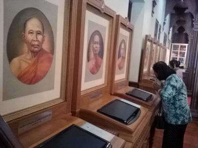 館内も教会風な造りですが祭壇部分に置かれているのは前プミポン国王の胸像。周囲の壁には歴代住職と思われると肖像画があります。それぞれにモニターが設置されていますが故障中なのか視聴できないのがタイらしいところ。2階はこの寺院で出家修行した歴代王が使用した品々が部屋別に展示されています。私にはいまいちぴんとはきませんが、タイ人にとってはとてもありがたい神聖なものなんだろうなと思います。- 旅行時期