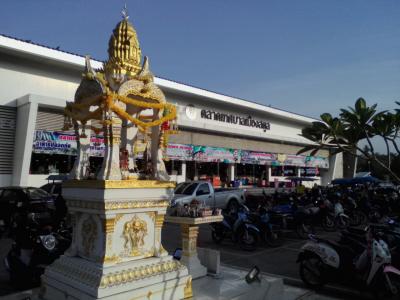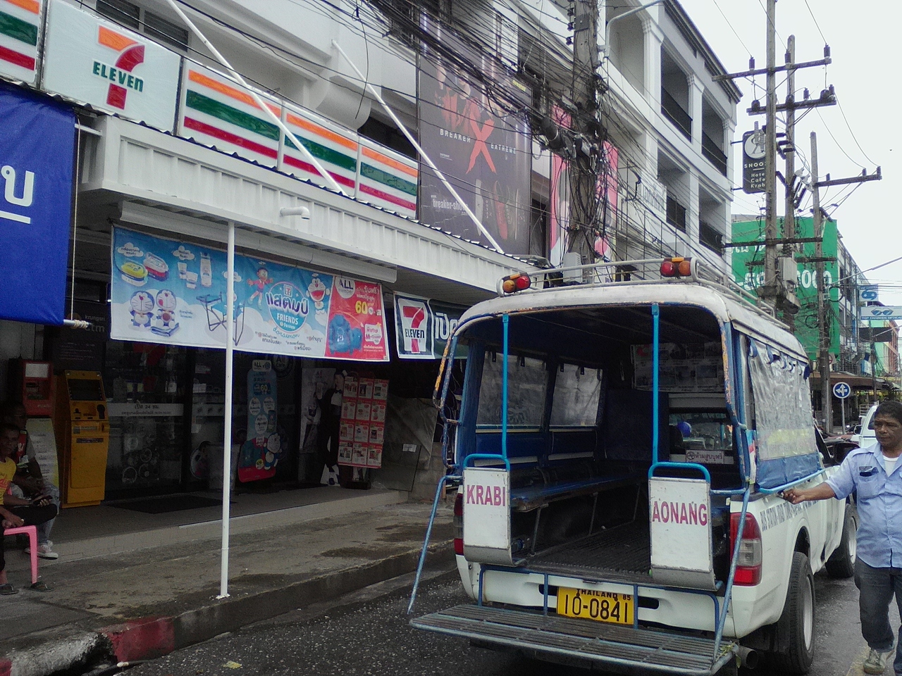 クラビータウンではマハラート通り、原始人信号の南120mにあるセブンイレブン前のバス停が乗りやすいです。南行き車線側がビーチ行き、北行き車線側がバスターミナル行きです。