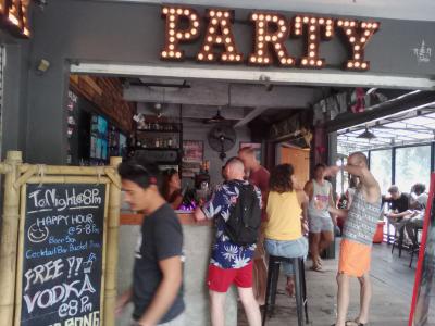 ビーチからは約1.7km離れていますが、Agodaでドミ1泊89B(約304円、諸費用込み)という激安料金に惹かれ予約しました。で、当日訪ねると宿泊拒否。初めは何を言われているのか理解できませんできたが、よく聞くと35歳以上は宿泊できないらしいのです。後でAgodaの予約ページをよく見たらの下の方にちょろっと書いてありました。タイのチェンマイにも年齢制限のある宿がありましたが(今もあるかは未確認)、そうそうないと思います。おそらく年寄りとは“ノリ”が違うということなのでしょう。宿の名前からしてイケイケですから。実際に私が到着したのが昼の12:00頃でしたが西洋人の若者がビール飲みながらすでに盛り上がってましたから。よく確認しなかった私が悪いですね。宿のポリシーなので文句を言うつもりはありませんが、もう少しわかりやすいところに書いておいてほしかったです。Agodaで事前にカード引き落としで支払っていましたがちゃんと返金してもらえました。
