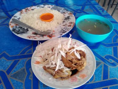 クア地区にある大型の大衆ナシアヤムの店です。17:00で閉まる言われましたが17:30に前を通りかかったらまだ営業中。私が食べてる最中に片付け始めたので滑り込みセーフでした。もちろんオーダーしたのは看板商品であるナシアヤム。盛り付けるだけなのであっという間に出てきます。ここのはライスとキチンが別盛り。ライスは軽くフライドされた感じでチキンには黒い甘めのタレが付いています。まぁおいしいですが好みが分かれるところかも。お値段は5.5RMと書かれていましたが10RM札で払ったらお釣りが4.55返ってきました。5.45RMってこと?不明です。安いせいかライスの量が少なく物足りなかったです。