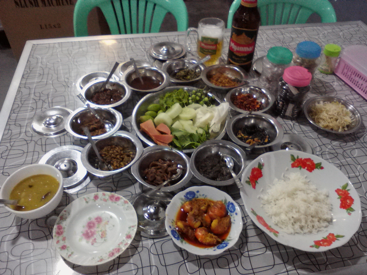お値段はエビカレー3000k(肉系は3000k、魚2500k、野菜系700k)、ご飯600k(食べ放題)、ミャンマービール大びん2500kの計6100k(約435円)。大量の副菜が付くのでお得と言えばお得なのですがやはり高いかなと。安い店ならおかずとご飯で1500kですから。なので一回行けばいいかな的な店かなと思います。どうせ行くなら複数人で行っておかずをシェアすれば更にお得感は増すと思います。昼に覗いたときは結構混んでましたが、夜18:30頃行ったらガラガラでした。- 旅行時期