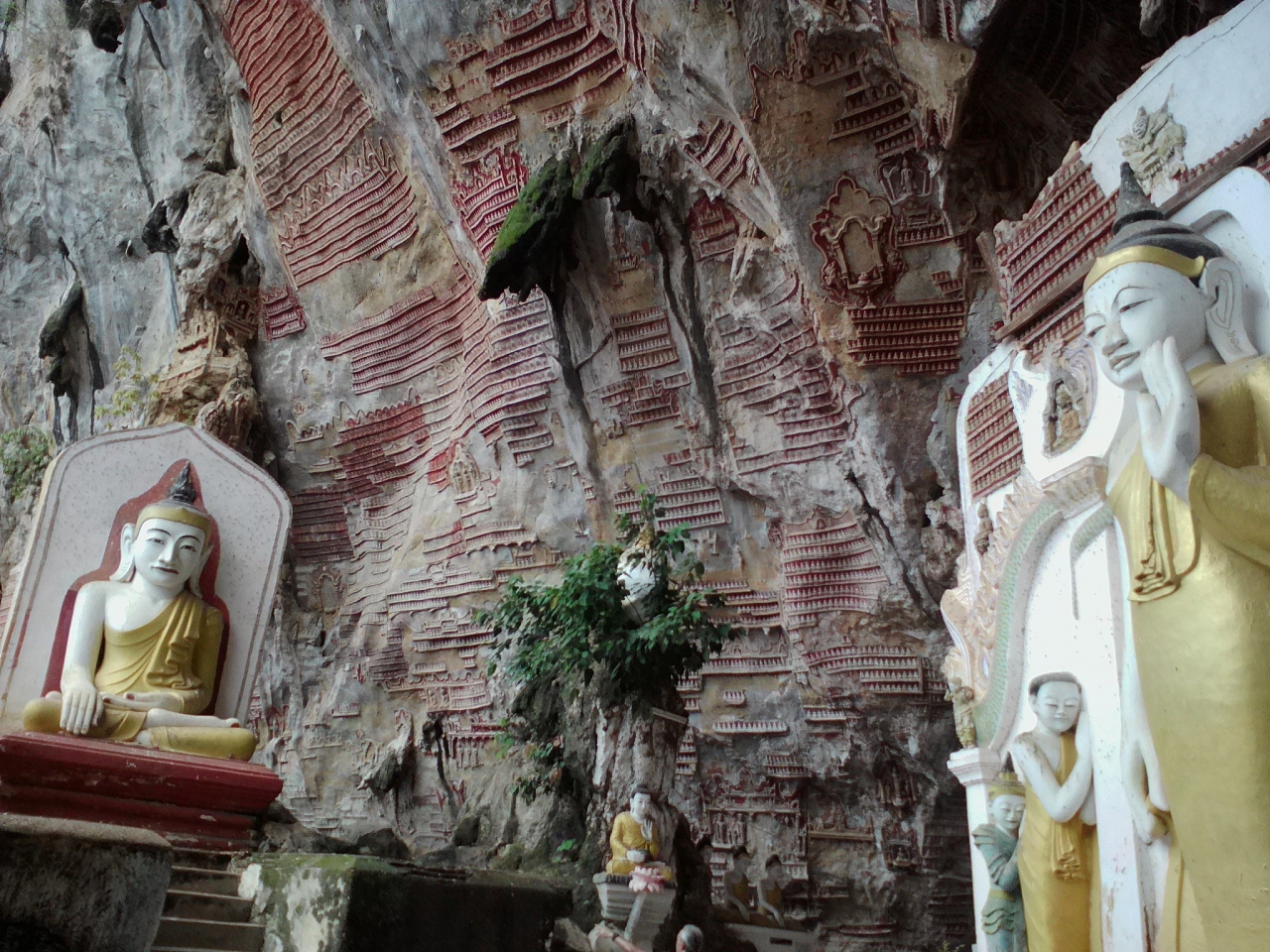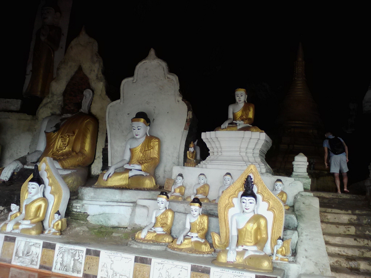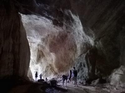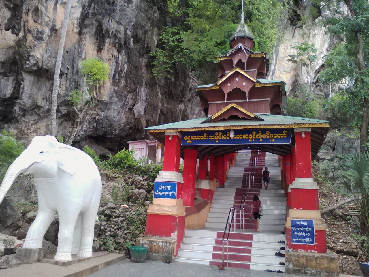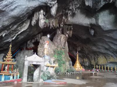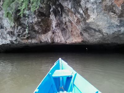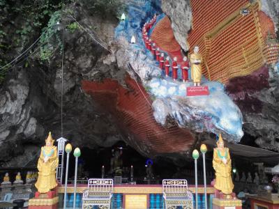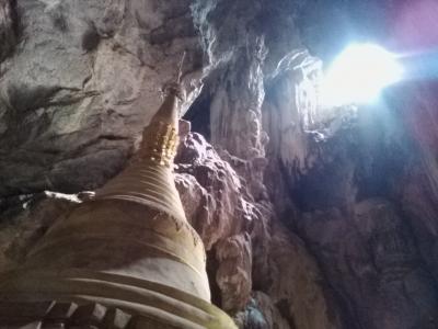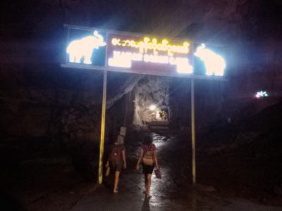 2頭の白い象が出迎える階段を上がると洞窟の入口です。入場料は1000k。入口付近は広い空間で仏塔やら仏像が数多くあります。その先からは本格的な洞窟。一応、通路や階段が設けられていますが十分に整備されておらず、灯りも少なくほぼ真っ暗です。1人だとちょっと怖いかも。コウモリがいるようで鳴き声が聞こえます。入口で履き物を脱がなければならないので足も結構汚れます(泥やコウモリの糞など)。700〜800m歩くと出口です。出口の先にも別の洞窟寺院があります。また歩いて戻ってもいいですが手漕ぎボートで戻ることもできます(1人2000k)。頭すれすれの洞窟内の水路を抜けると視界が開け景色がいいです。ボートに乗るつもりなら履き物を持って洞窟に入った方がいいと思います。- 旅行時期