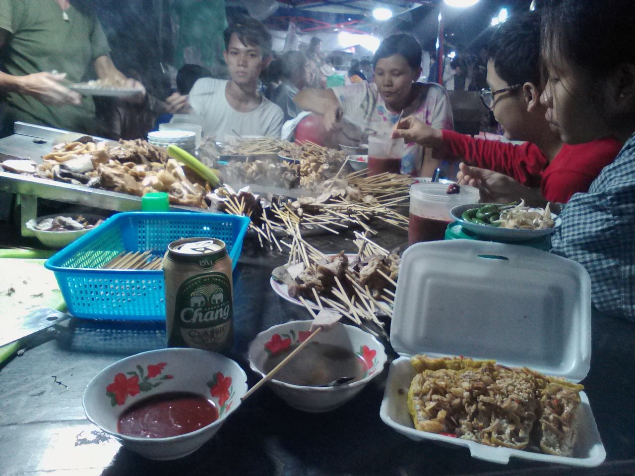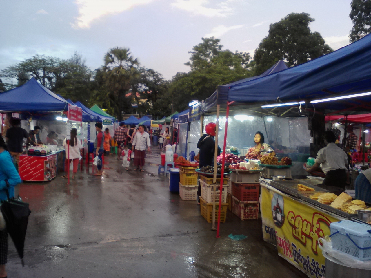 カン ター ヤー湖(Kan Thar Yar Lake)の西の端の湖畔で開かれます。小じんまりしていますがなかなかの充実ぶり。ミャンマーらしい食べ物、そうでない食べ物いろいろありますがおすすめしたいのが“ワッタードゥトー”と呼ばれる豚モツの串屋さん(普通に町中にもありますが…)。赤ちょうちんの似合うおでん屋のようで雰囲気抜群です。串1本どれでも100kという激安にして超明朗会計なので安心して食べられます。ビールなしでは始まらない店ですがナイトマーケット内のビールの販売はなし。ナイトマーケットを左に出て100mほど先にある飲み屋(ミャンマービールの看板あり)でビールが買えます。