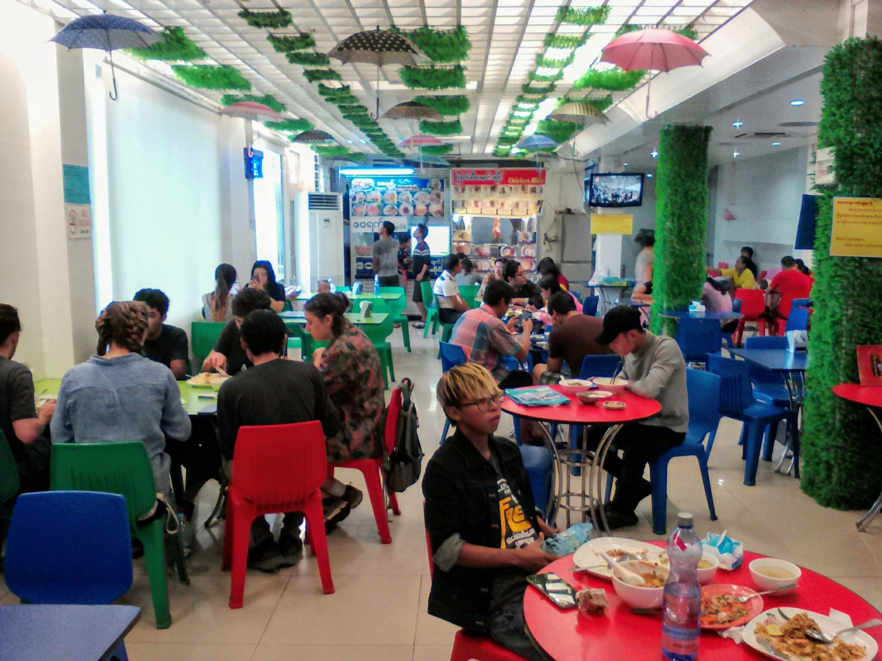 パアン時計塔近くにあるショッピングモール。と言っても田舎のデパート(と言ってもかなりしょぼめの)です。1階にはコンビニに毛が生えたレベルのスーパーマーケット、4階にはちゃんとフードコートもあります。いわゆるフードコートと呼べるかは微妙ですが…。しかしなかなかどうしてメニューは意外と充実していて安いです。メニューは写真付き値段付きで張り出されているので注文は指をさすだけでOK。とても助かります。ワンタン麺(1000k)、普通の麺(1000k)、USAフライドライス(2000k)、ガパオライス(1000k)などを食べましたがどれも一見豪華。しかし味はう〜むといった感じです。決してまずくはありませんので。もちろんアルコールの持ち込みもOK。1階の入口脇の酒屋で買えます。「REGAL SEVEN」というビールの330ml缶なら700kで買えます。フードコートの営業時間は8:00-20:00です。特に土日の昼食、夕食時は結構混んでいます。