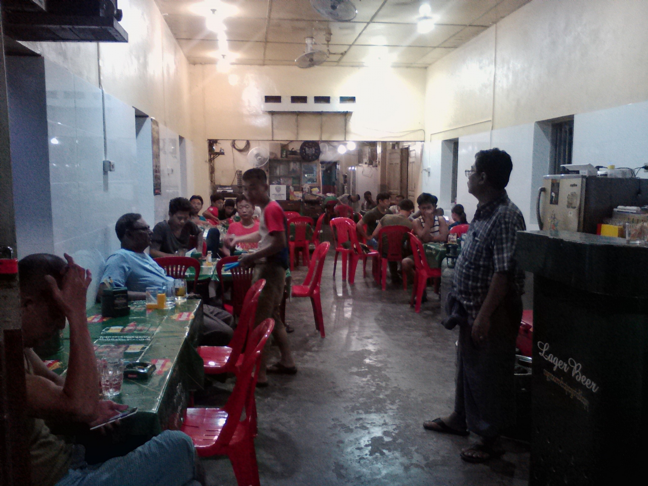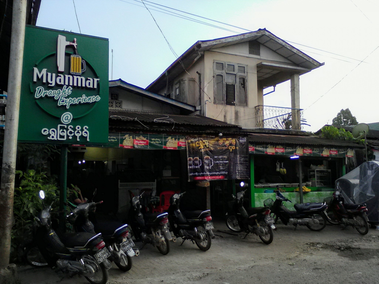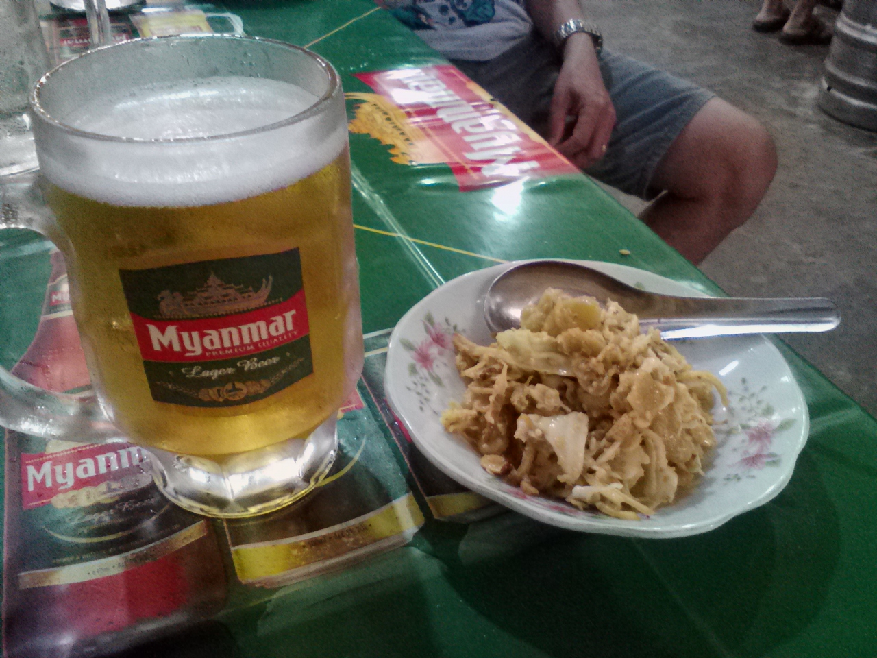 “樽”から注ぐ生ビールもあります。ミャンマービールはグラス1杯850k、BLACK SHIELDという黒ビールは1200kです。おすすめのつまみはトマトサラダとジンジャーサラダ。おばちゃんに言えば作ってくれます。小皿に盛られてどちらも500k。1人で食べるのにちょうどいい量、うまいです。夕方には飲んべえ達が集まり、とってもいい感じ。やっぱりローカルな飲み屋はおもしろいです。