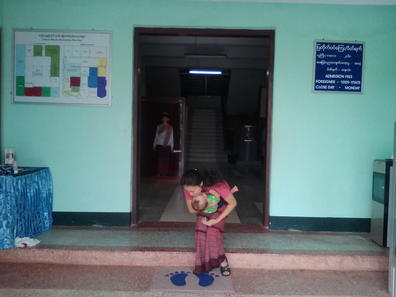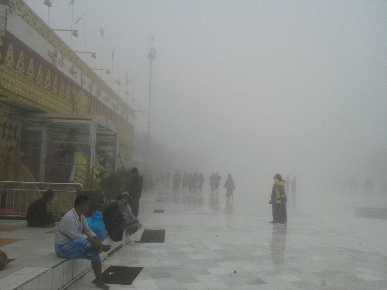 さ、寒い。キンプンとはえらい温度差です。しかも雲の中、ガスってます。目指すパゴダへは400mほど、徒歩で向かいます。両脇にはレストランや土産物屋が並んでいます。途中にチケットオフィスがあり、外国人は1万k(約720円)を支払います。その先から土足禁止ゾーン。私はここでサンダルを預けました(200k)。ミャンマー人は手で持って行く人もいました。で、ここで問題が。私の履いてたひざが隠れるくらいのハーフパンツがNGとのこと。1000kでロンジーを借りろと言う。けどハーフパンツの若者が続々入っていくので抗議するとあっさりOKとなりました。