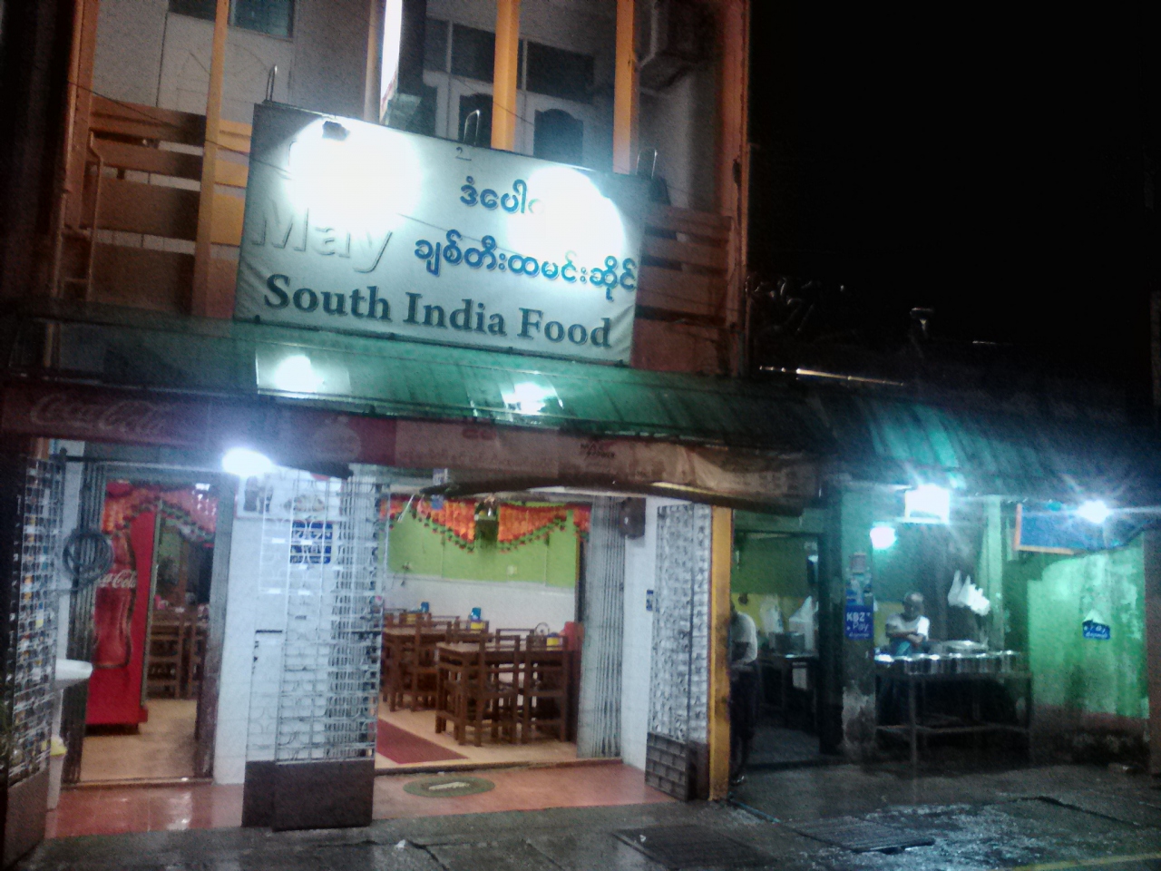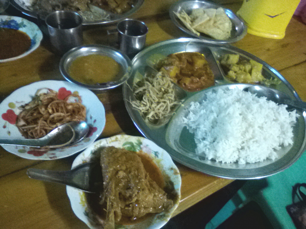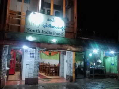 「May」という名の南インド料理レストランです。夕食を食べに行ったら客がいっぱいでびっくり。と言っても皆持ち帰り客。店員のすすめでセットメニュー(ミールス)をいただくことに。で、チキンをチョイス。ミールスらしく金属製のプレートに盛ってくれます。野菜カレー2種、もやし、ライス。別皿でアチャール、パパド、そしてチキンカレー。なかなか豪華です。これでお値段3000k(約215円)。まあお得かなと思います。味もおいしいです。無料でご飯のおかわりができました。もちろんベジにすればもっとお安く食べられます。