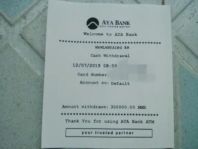 とある方のブログでミャンマーでATMを利用するなら「KBZ BANK」か「AYA BANK」がおすすめと書かれていたのでATM利用手数料を調べてみました。どちらも1回の操作あたりの引き出し限度額は30万チャット(約21500円)。利用手数料はKBZ BANKが6500チャット(約465円)(操作中に画面に表示されます)。AYA BANKは表示されなかったので窓口で聞いたら6000チャットと言われました。