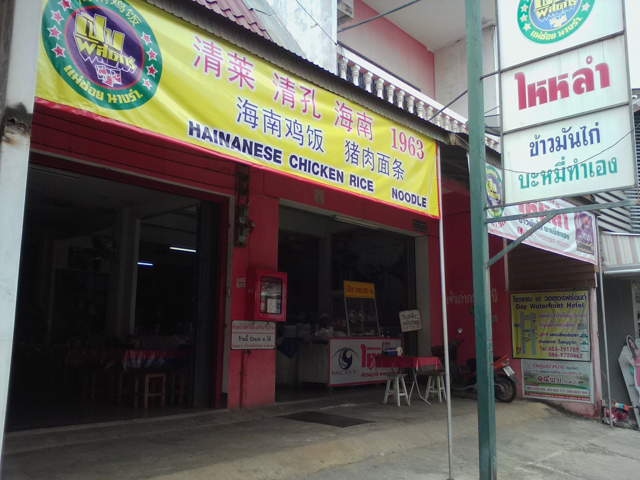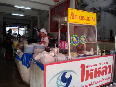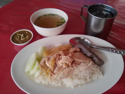 創業56年の老舗のカオマンガイ屋です。海南鶏飯と漢字で書かれた店名が何か親近感を覚えます。タイ語ではカオマンガイ ハイラムといいます。カオマンガイのタマダー(普通盛り40B)をオーダー。皿に盛り付けるだけなのであっという間に出てきます。お味は…うまいです。間違いないうまさ。辛いソースが付いてくるので分量はお好みで。トート(揚げ鶏)はありません。ピセート(大盛り)は50Bです。